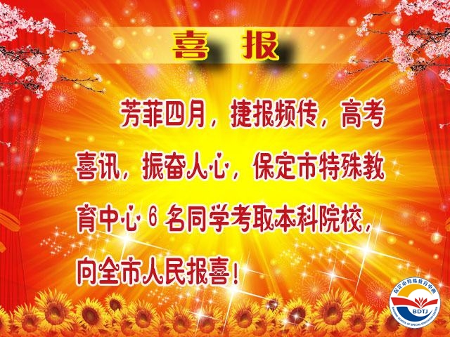 芳菲四月,捷報(bào)頻傳,高考喜訊,振奮人心,保定市特殊教育中心向全市人民報(bào)喜! 歷史新紀(jì)錄一 : 我校啟聰部高三10名學(xué)生參加2013年特殊教育院校高考,本科上線6人,??粕龑W(xué)率百分之百,在2012年保定市特殊教育高考...