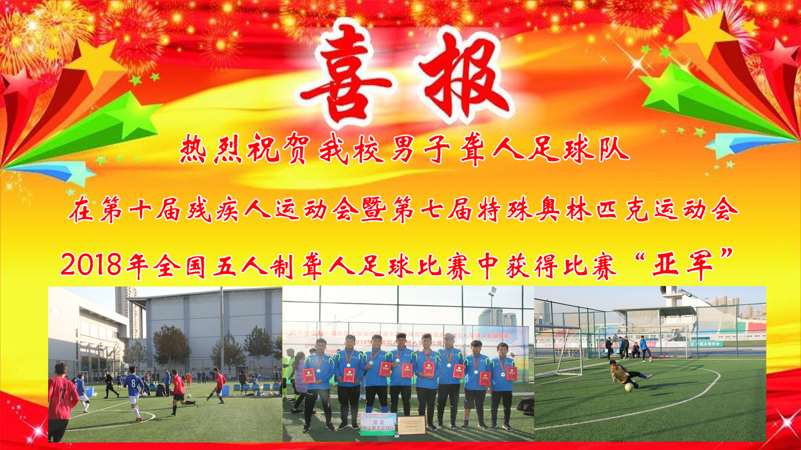 11月6日上午,第十屆殘疾人運(yùn)動(dòng)會(huì)暨第七屆特殊奧林匹克運(yùn)動(dòng)會(huì)五人制聾人足球預(yù)賽暨2018年全國(guó)五人制聾人足球比賽現(xiàn)場(chǎng)傳來(lái)捷報(bào):保定市特殊教育中心男子聾人足球隊(duì)代表河北省獲得比賽亞軍!這是我校代表隊(duì)參加全國(guó)殘疾...