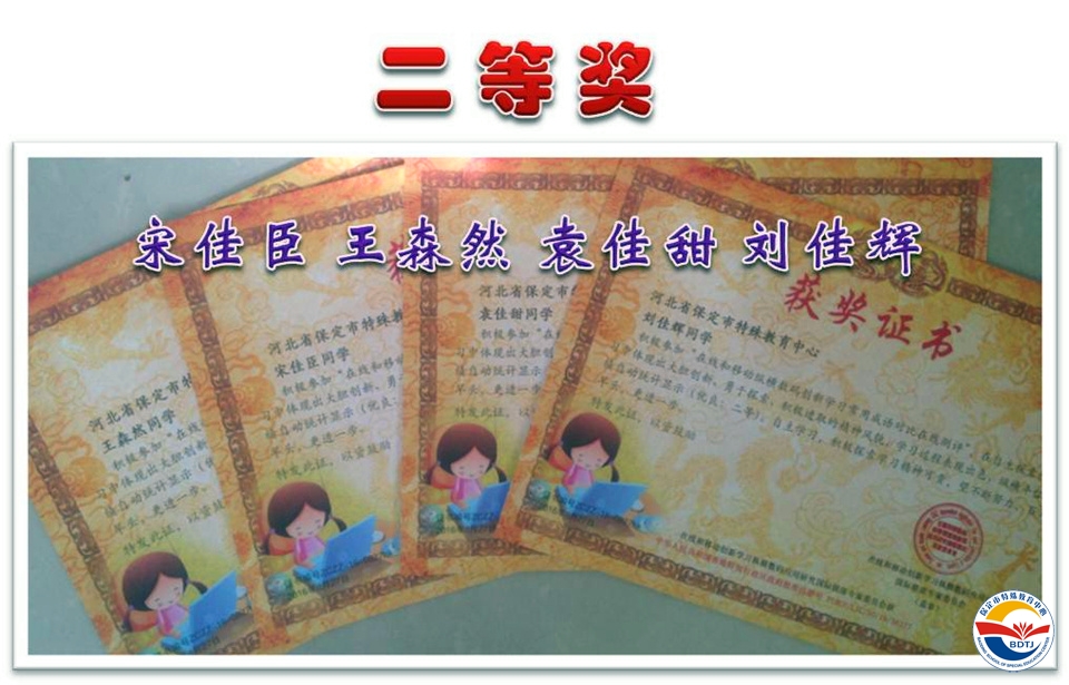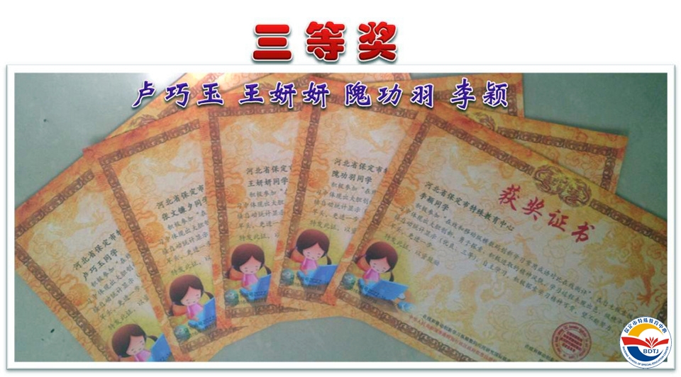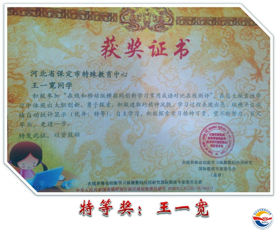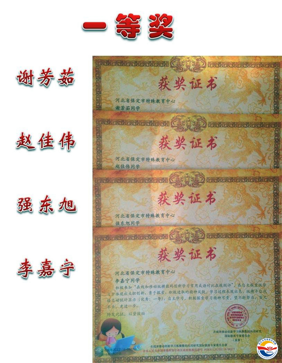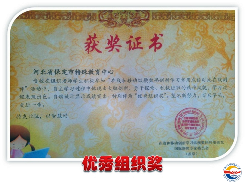 新學(xué)期伊始,保定市特殊教育中心又傳喜訊,學(xué)校師生獲得“在線和移動(dòng)創(chuàng)新學(xué)習(xí)縱橫數(shù)碼應(yīng)用研究國(guó)際聯(lián)席專(zhuān)家委員會(huì)組織的首屆在線成語(yǔ)測(cè)評(píng)比賽”的多項(xiàng)大獎(jiǎng)。梁連壯、高瑩瑩、賈慧敏三位老師獲得教師組一等獎(jiǎng),李施瑜、楊瑞華兩位老師獲得教師組二等獎(jiǎng)。王一寬同學(xué)獲得特教組特等獎(jiǎng),趙佳偉、謝芳茹、李嘉寧、強(qiáng)東旭四位同學(xué)獲得特教組一等獎(jiǎng),另外,袁佳甜等九名同學(xué)分獲二三等獎(jiǎng)。在此次大賽中,保定市特殊教育中心脫穎而出,被專(zhuān)家組評(píng)為“首屆在線成語(yǔ)測(cè)評(píng)集體優(yōu)秀組織獎(jiǎng)”。