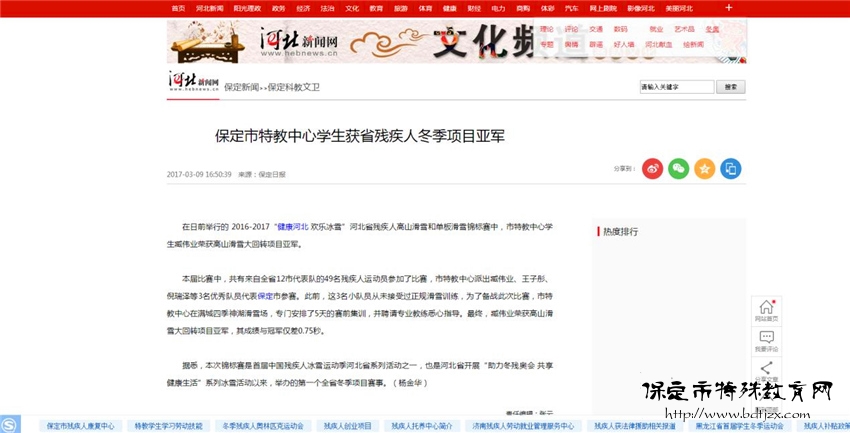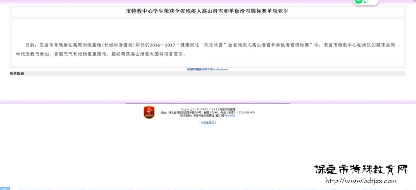 2017年3月的保定市人民政府網(wǎng)、保定市教育信息港、《保定日?qǐng)?bào)》和河北新聞網(wǎng),接連報(bào)道了我校在代表保定市參加“ 2016-2017‘健康河北 歡樂冰雪’河北省殘疾人高山滑雪和單板滑雪錦標(biāo)賽”中,我校臧偉業(yè)同學(xué)榮獲高山滑雪大回轉(zhuǎn)項(xiàng)目亞軍的消息。今后,我校將在新增設(shè)的冰雪運(yùn)動(dòng)課中,為適合此項(xiàng)運(yùn)動(dòng)的殘障學(xué)生提供更為廣闊的平臺(tái),為迎接冬奧會(huì)貢獻(xiàn)自己的力量。