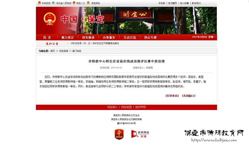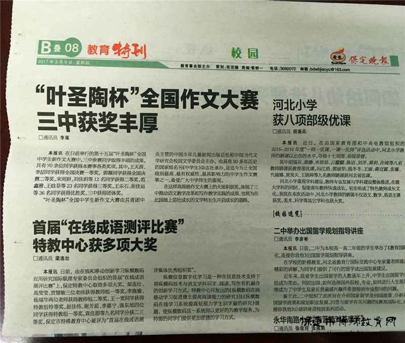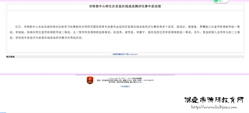 2017年3月的保定市人民政府網(wǎng)、保定市教育信息港和《保定晚報(bào)》,接連報(bào)道了我校在首屆“在線成語測評(píng)比賽”中獲多項(xiàng)大獎(jiǎng)的消息。我校教師通過自己的不懈努力,探索出“互聯(lián)網(wǎng)+語文教學(xué)”的創(chuàng)新教學(xué)形式,借助縱橫在線學(xué)習(xí)模式和豐富的在線資源,進(jìn)行探索與研究,為特需的同學(xué)們探索更加便捷的學(xué)習(xí)方式。
