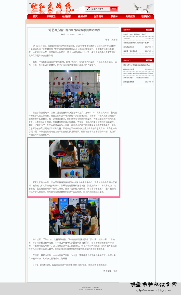 我校全盲的孩子第一次參加了正常人的魔方復(fù)原比賽,在經(jīng)過短時(shí)間訓(xùn)練后,在二階魔方復(fù)原賽上取得了不錯(cuò)的反響,開創(chuàng)了世界盲人復(fù)原魔方的先河。