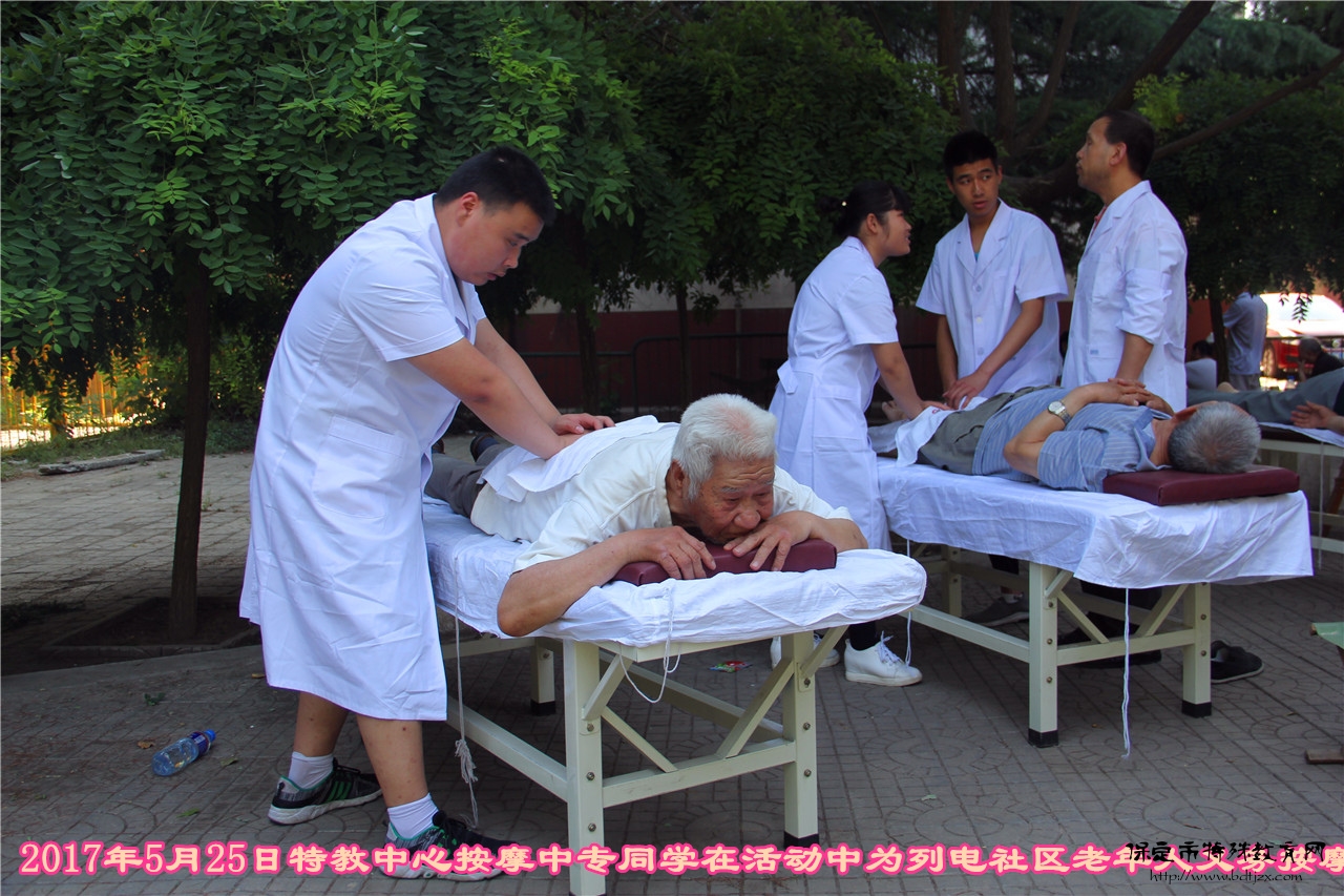 5月25日下午,驕陽似火,黨員教師帶領(lǐng)盲中專學生來到列電社區(qū),受到了社區(qū)居民的熱烈歡迎。整齊的按摩床,潔白的床單,服裝統(tǒng)一的師生們,迎來一批批體驗按摩的居民。師生們首先與前來按摩的每位居民溝通,了解他們的情況,有針對性的進行按摩治療,兩個多小時的時間共接診幾十余人次。雖然烈日炎炎,雖然汗水濕透了衣衫……,但師生們始終面帶微笑,因為他們能用自己所學的知識回饋了社會、回報社區(qū)居民,他們感到由衷的幸福,社區(qū)的居民也紛紛為黨員教師點贊、為同學們點贊。