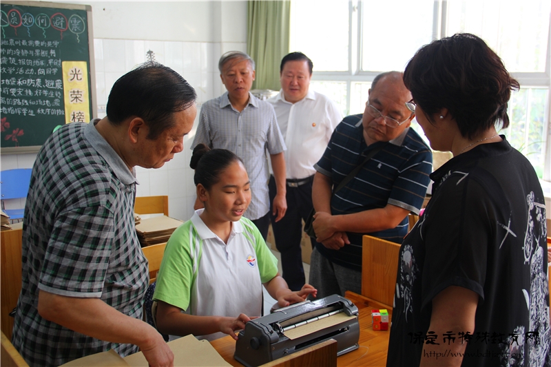督導(dǎo)組一行還檢查了部分智障學(xué)生和盲生核心價值觀及中國夢的背誦情況,饒有興趣的觀看了學(xué)生盲文閱讀及盲文打字,并與盲生親切合影,鼓勵盲生身殘志堅,超越障礙,追逐夢想。