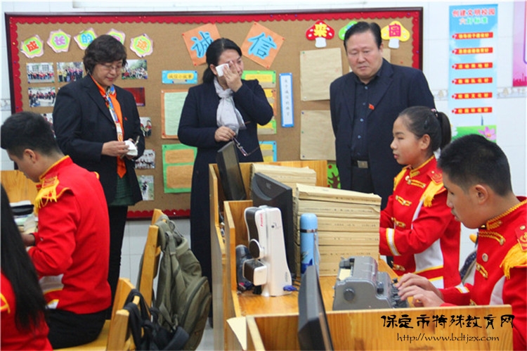 在操場上,楊市長一行觀看了“龍之翼”聾足隊員訓(xùn)練,當了解到學校聾人足球隊和特奧足球隊多次代表河北省參加全國比賽,并獲得全國第二、第三的好成績時,贊不絕口,鼓勵學生苦練基本功,為保定市爭光!。在盲教室里,低視力和全盲的學生分組進行了展示,低視力學生使用大字課本,可以借助接收器和注視器,將黑板上的板書在注視器上放大至清晰可辨;全盲的學生使用的是盲文課本,靠摸讀和盲文打字,兩位盲生現(xiàn)場摸讀朗誦《生命的顏色》,當學生讀到“我看不到花的顏色,我不知道什么是紅色、我不知道什么是藍色,親愛的媽媽呀,你到底長得什么樣?”時,楊市長悄然淚下,她為學生因身體殘疾,無法看到繽紛的世界而痛心,也為學生身殘志堅、樂觀向上的精神而感動,她聽學生講到希望上普通高中,考取重點大學的理想時,叮囑學生自立自強,超越障礙,追逐夢想。并與學生親切合影。
