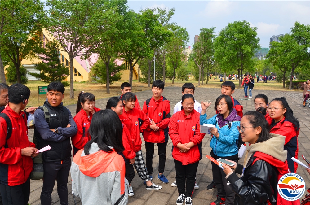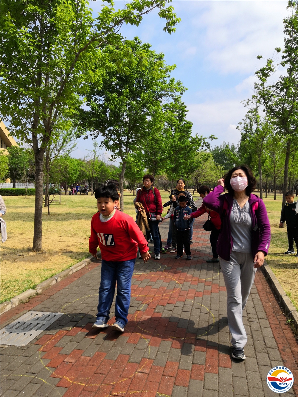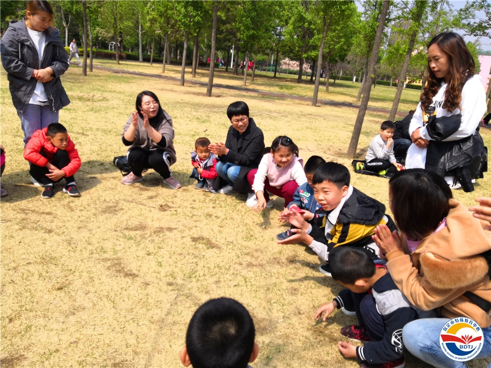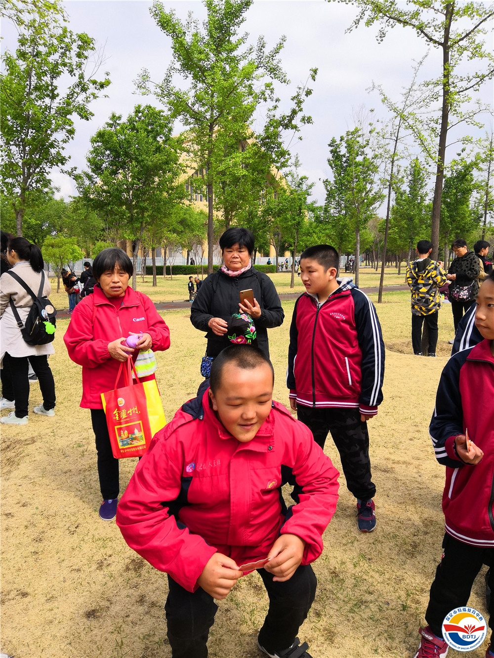 游玩并欣賞了滿園的美景后,“尋寶”活動開始了,學生們玩兒的不亦樂乎,場面熱烈而歡快。只見啟智部學生在老師的帶領下做起了趣味游戲,伴隨著老師和家長的加油聲,孩子們或蹦或跳,純真的小臉洋溢著歡笑。