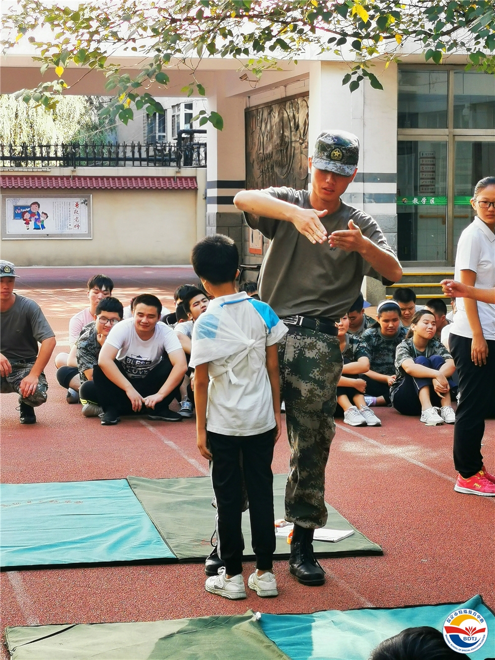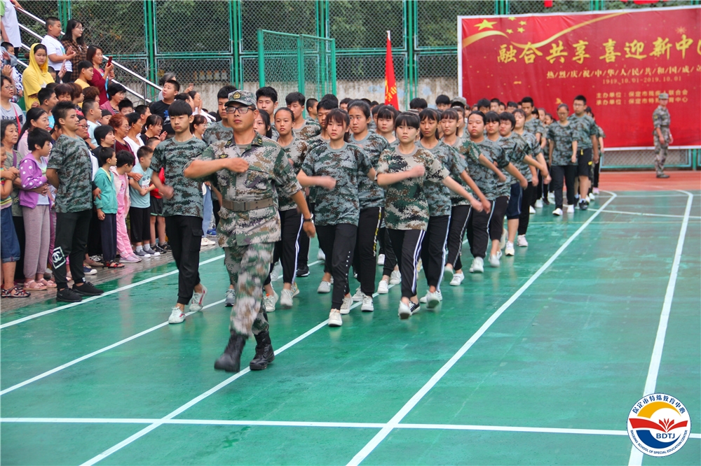 “格斗準備!”伴隨著教官的指令,“哈!”一聲整齊有力的吶喊聲,保定市特殊教育中心啟聰部、啟明部的同學們昂首挺胸,精神百倍地站在操場上,軍體拳表演開始了……
