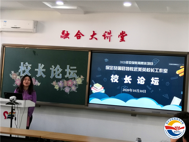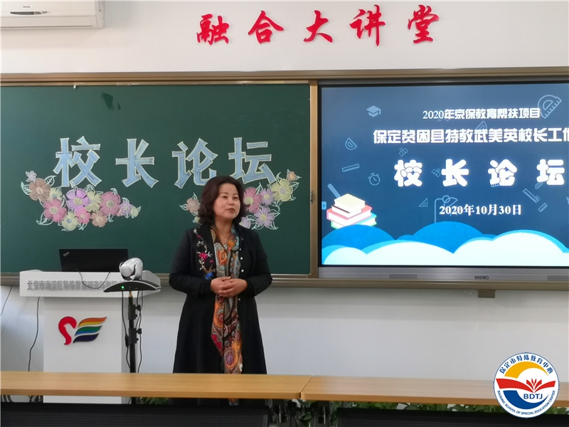 工作室主持人武美英校長主持本次論壇,武校長首先感謝北京市教委、海淀區(qū)教委、海淀區(qū)特殊教育研究與指導(dǎo)中心、健翔學(xué)校以及特殊教育領(lǐng)域的專家們,一直以來對(duì)保定市特殊教育的支持與幫助,工作室從七月云端啟動(dòng)以來,第二項(xiàng)活動(dòng)就是六位專家分三組到八個(gè)貧困縣現(xiàn)場指導(dǎo),把診問脈,指出學(xué)校發(fā)展方向以及教育教學(xué)管理中存在的問題,幾個(gè)月以來,各位校長向書本學(xué)習(xí)(每人研讀一本書)、向?qū)<覍W(xué)習(xí)(聆聽六位專家講座)、向名校學(xué)校(到健翔學(xué)校跟崗),經(jīng)過一些列活動(dòng),八位校長在辦學(xué)理念、辦學(xué)思想、教育教學(xué)管理方面有了不同層次的提升。