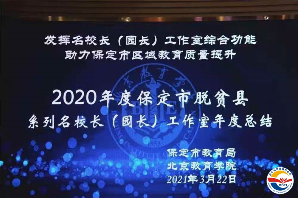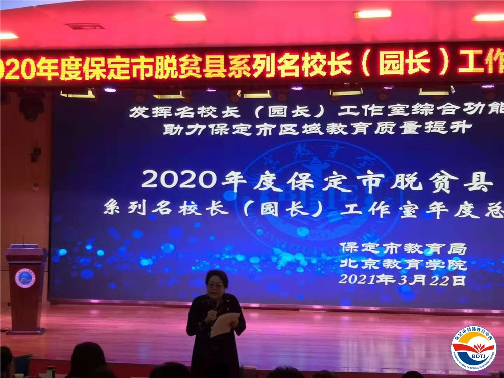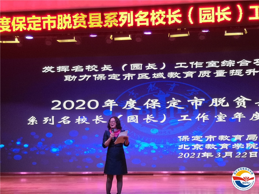 為推進京保教育扶貧協(xié)作,充分發(fā)揮名校長工作室職能,助力保定市區(qū)域教育質(zhì)量提升,3月22日上午,“保定市脫貧縣特教學校武美英校長工作室”主持人保定市特殊教育中心校長武美英、實踐導師北京健翔學校校長于文及全體工作室成員校校長參加了保定市教育局和北京教育學院舉辦的2020年度保定市脫貧縣系列名校長(園長)工作室年度總結(jié)會。北京教育學院高級研修中心主任陳麗教授主持會議。
