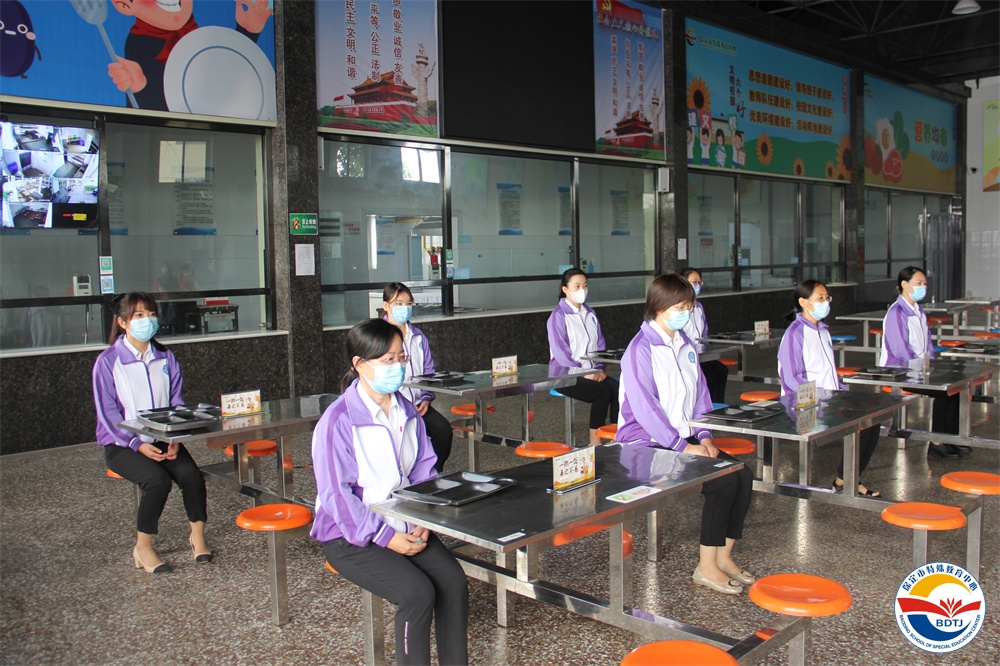 取餐盤——間隔一米排隊取餐——同向就坐用餐。學生就餐期間帶班領導和值班干部陪餐,教師進行就餐秩序巡查。