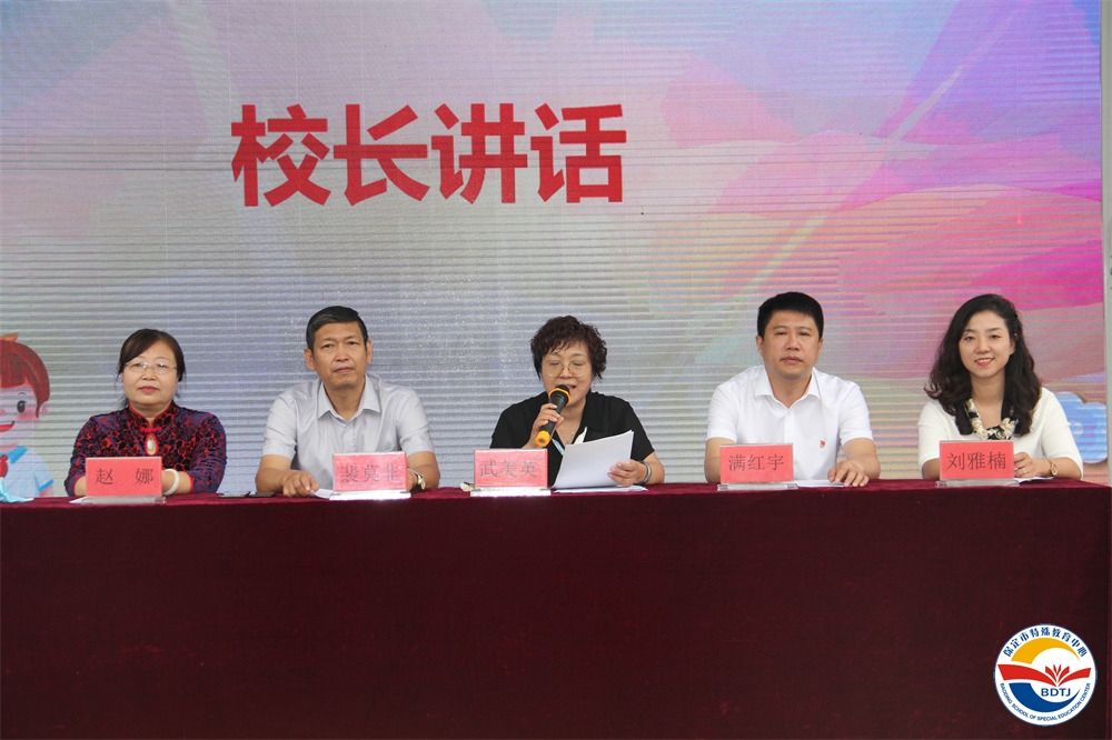武美英校長在熱烈的掌聲中做了熱情洋溢的發(fā)言。武校長首先向承載著父母囑托的新生表示熱烈歡迎。隨后,介紹了在過去一年來學(xué)校取得的一系列光輝的成績,特別為大家?guī)睃h書記在六一慰問后,親自批復(fù)建設(shè)學(xué)校操場及康復(fù)運動中心;中殘聯(lián)副理事長程凱在省、市領(lǐng)導(dǎo)的陪同下到校視察,為學(xué)校發(fā)展指明方向等好消息。武校長還特別總結(jié)了過去的一年,是學(xué)校最受各級領(lǐng)導(dǎo)關(guān)注的一年,是愛心人士捐贈并關(guān)注最多的一年,是學(xué)校取得豐碩成果的一年,是教師業(yè)務(wù)成長最快的一年,是學(xué)生獲獎最多的一年,還是高考成績最輝煌的一年!