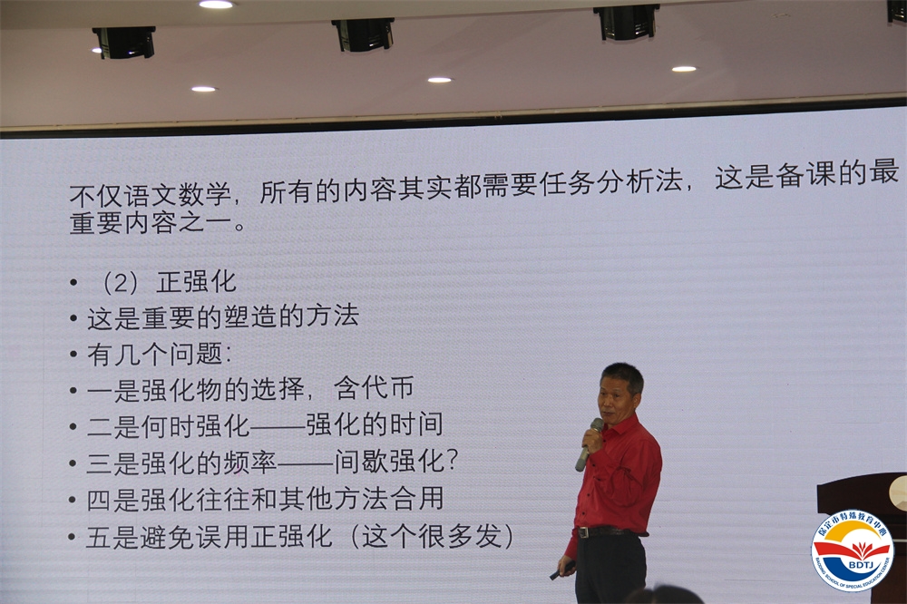 副校長(zhǎng)裴莫非隆重介紹北京聯(lián)合大學(xué)劉全禮教授,接下來(lái)劉教授做了《培智學(xué)校兒童的行為教育》的講座,重點(diǎn)講解了行為機(jī)制的價(jià)值所在,行為教育的內(nèi)容及行為糾正方法等。劉雅楠副校長(zhǎng)介紹了北京市海淀區(qū)特殊教育研究與指導(dǎo)中心主任王紅霞主任,并請(qǐng)王主任做了《特殊教育教師專業(yè)化培養(yǎng)及學(xué)生案例分享》的講座,對(duì)培智學(xué)校的教與學(xué),特教教師專業(yè)化發(fā)展路徑,利用資源滿足學(xué)生個(gè)性化需求進(jìn)行了詳細(xì)的講解。講座之后,學(xué)員們暢所欲言,積極互動(dòng),探討在教育過(guò)程中遇到的問(wèn)題,改進(jìn)教學(xué)方法,合力解決教育難題。