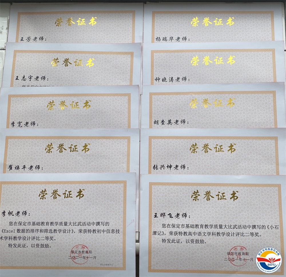 新學(xué)期伊始,我校傳來(lái)喜訊。我校教師參加市教科所組織的2021年度保定市教育教學(xué)質(zhì)量提升大比武系列活動(dòng),學(xué)校高度重視,精心組織,積極參加教育教學(xué)管理論文、教學(xué)課堂實(shí)錄、學(xué)科教學(xué)論文、課件、教學(xué)設(shè)計(jì)五項(xiàng)評(píng)比活動(dòng)