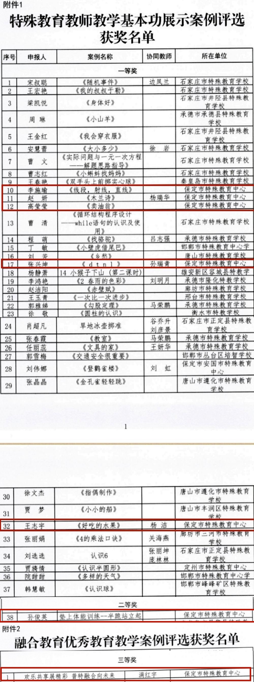 為貫徹落實《“十四五”特殊教育發(fā)展提升行動計劃》和教育數(shù)字化戰(zhàn)略行動的有關(guān)要求,深化特殊教育課程教學改革,提升教師特殊教育能力,豐富特殊教育數(shù)字資源,推動特殊教育高質(zhì)量發(fā)展,省教育廳組織開展了全省特殊教育教師教學基本功展示和融合教育優(yōu)秀教育教學案例遴選活動,保定市教育系統(tǒng)組織全市評比,優(yōu)選了9節(jié)基本功展示課例和5節(jié)教學案例上報河北省參評,經(jīng)過省里評比,6節(jié)基本功展示課獲省級一等獎,3節(jié)獲二等獎,融合案例1節(jié)獲一等獎、1節(jié)獲二等獎,3節(jié)獲三等獎。保定市特殊教育中心精心組織,積極參與評選活動,上報6節(jié)教學基本功展示課,其中展示課5節(jié)獲省級一等獎,1節(jié)獲省級二等獎,上報教學案例1節(jié)獲省級三等獎。