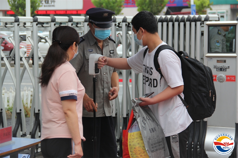 排隊等候,行李消毒、測溫、掃碼,核驗資料,學生安全有序進校。