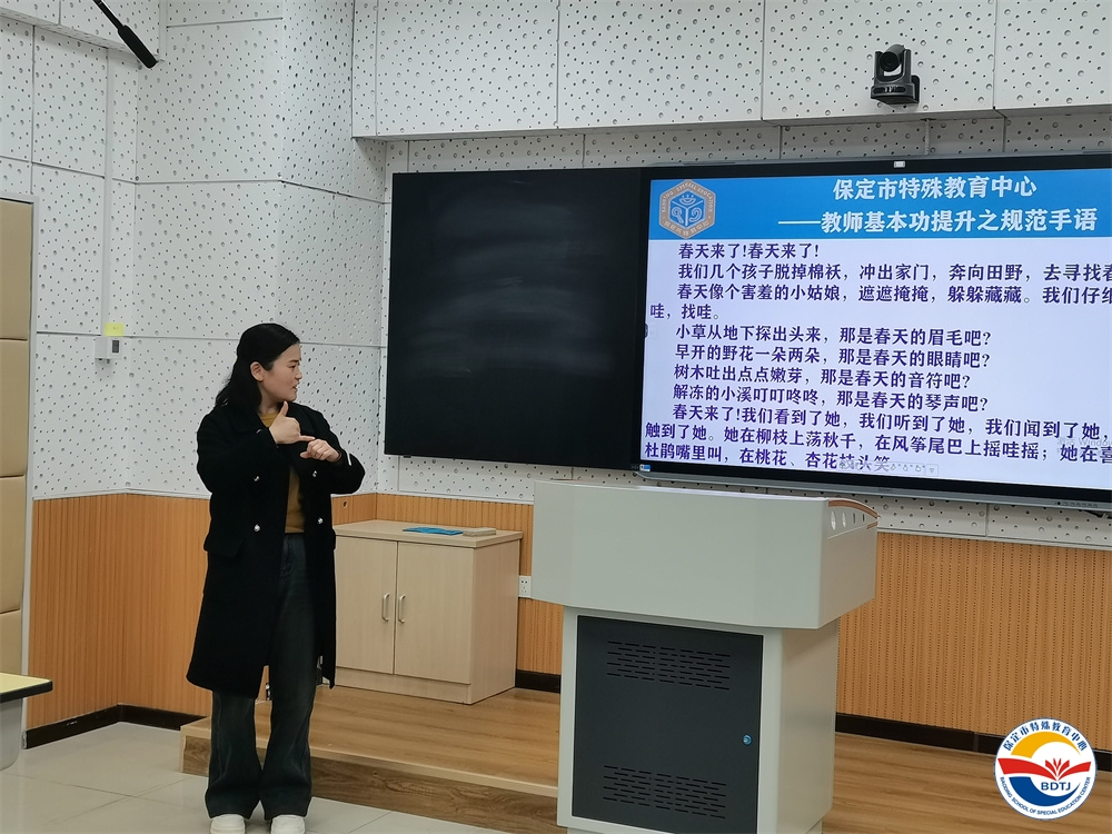 啟聰部主要圍繞“教師基本功提升之規(guī)范手語”展開討論,研究主題是“在課堂教學(xué)中手語和書面語之間如何轉(zhuǎn)換”,轉(zhuǎn)換過程僅關(guān)注方法和技巧,而是要明確轉(zhuǎn)換的目的是什么,確保落位在書面語的學(xué)習(xí)上。手語與書面語的詞匯不是逐一對應(yīng)的,在生成目的語時,要靠教師的經(jīng)驗、智慧和技巧,抓住關(guān)鍵信息,摸準(zhǔn)每個學(xué)生的語言水平基線,確定不同水平的“目標(biāo)培養(yǎng)點”,堅持個別化指導(dǎo)。老師們一起研究課文的段落講解示范與解讀,老師們邊看課文邊研習(xí)手語,大家根據(jù)自己所任教的學(xué)科各抒己見,相互支招,相互學(xué)習(xí)。