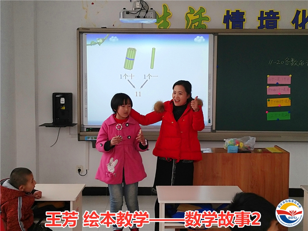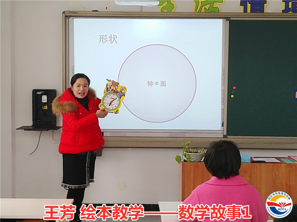 王芳老師送教的課程是聽障數(shù)學課,但是不同于傳統(tǒng)的講授式課堂,而是以“數(shù)學故事”的方式,讓孩子們在聽故事的過程中,自然而然的習得相應的數(shù)學知識。