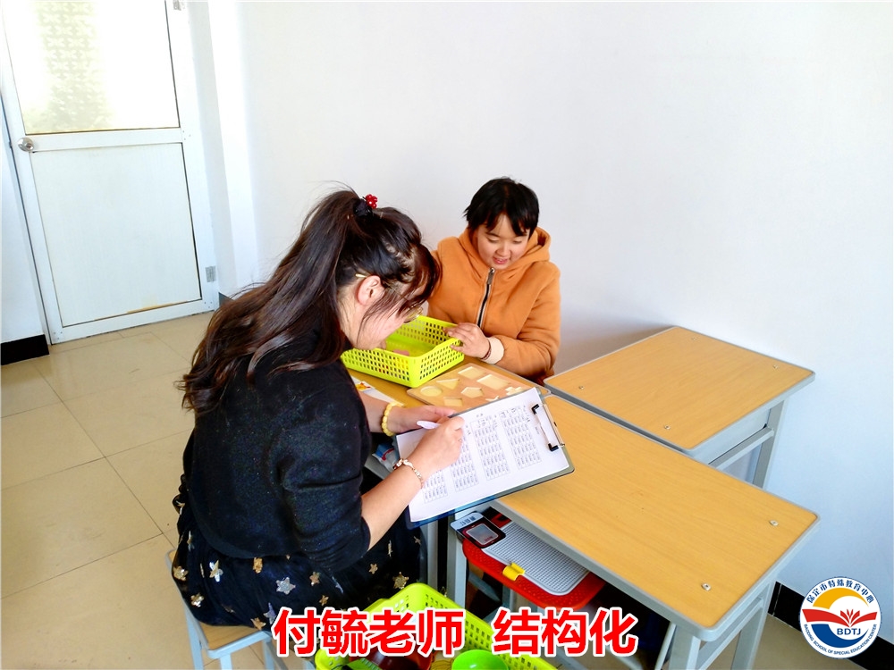 此次送教活動,付毓老師將“結(jié)構(gòu)化”的教學模式帶到了阜平特教,期望為阜平特教開辟一條更加合適特殊兒童教育的新道路。結(jié)構(gòu)化是高度的個別化,有利于培養(yǎng)學生的自主獨立能力,減輕教師的負擔。由于阜平特教班容量大,學生人數(shù)多,傳統(tǒng)的集體課堂教學方式不但老師上課費勁,“一刀切”的教學也會導致學生的學習積極性降低,學習效果不理想。同時,結(jié)構(gòu)化教學也是分層教學,教師通過對學生的評估設(shè)計適合學生的學習任務(wù),讓學生在一節(jié)課中都有所收獲,有所鍛煉。尤其針對自閉癥兒童,他們沒有對集體指令的反應,在集體教學中往往處于缺乏參與空白的狀態(tài),有了結(jié)構(gòu)化教學就能讓學生自主學習,樂學善學,增加課堂的參與度。