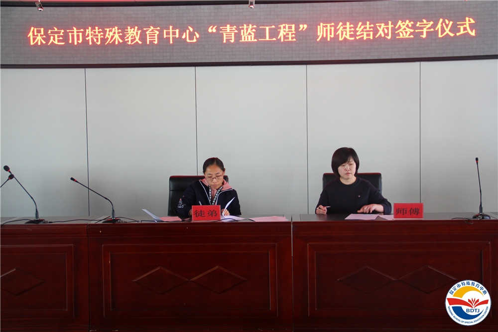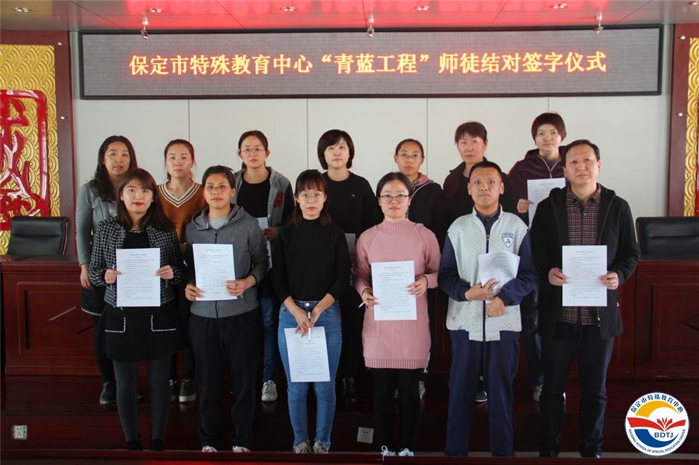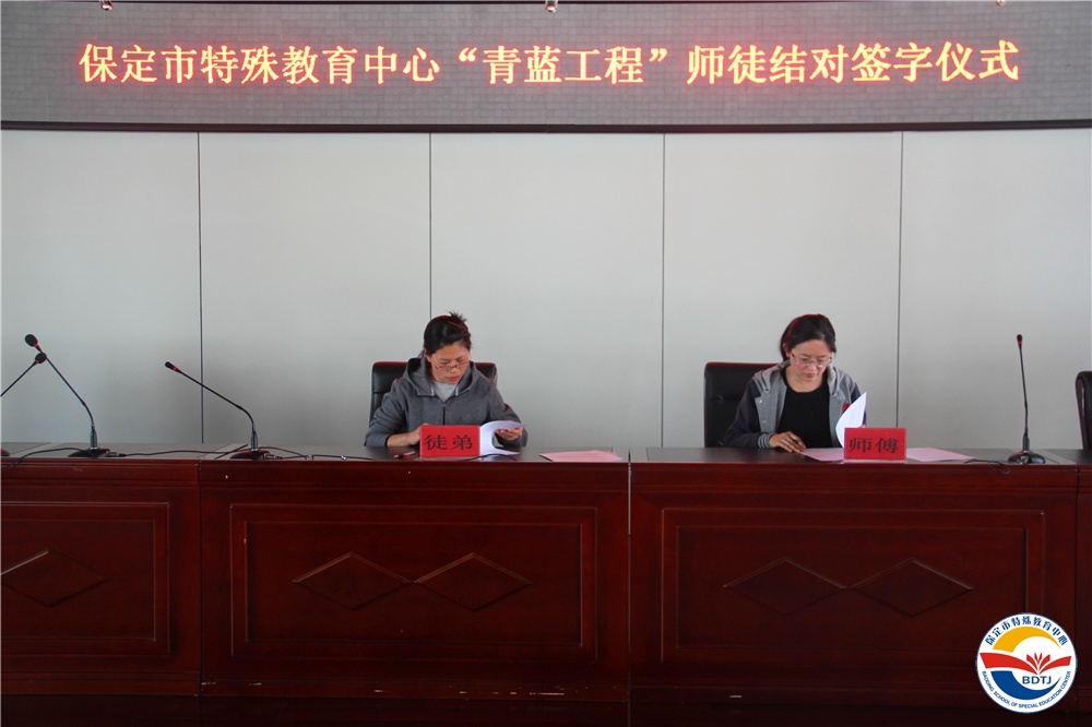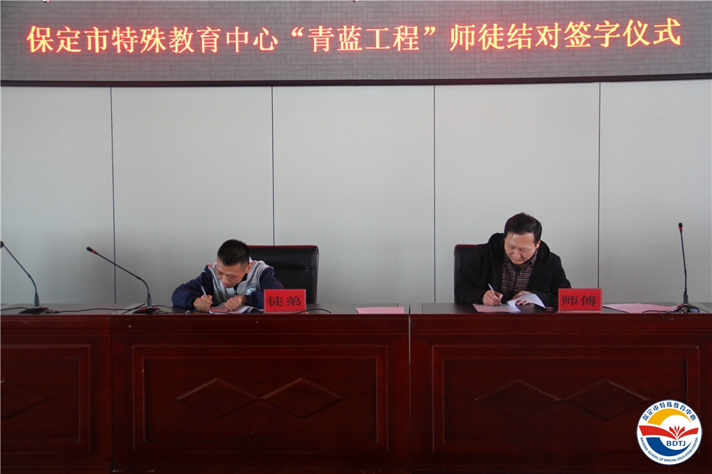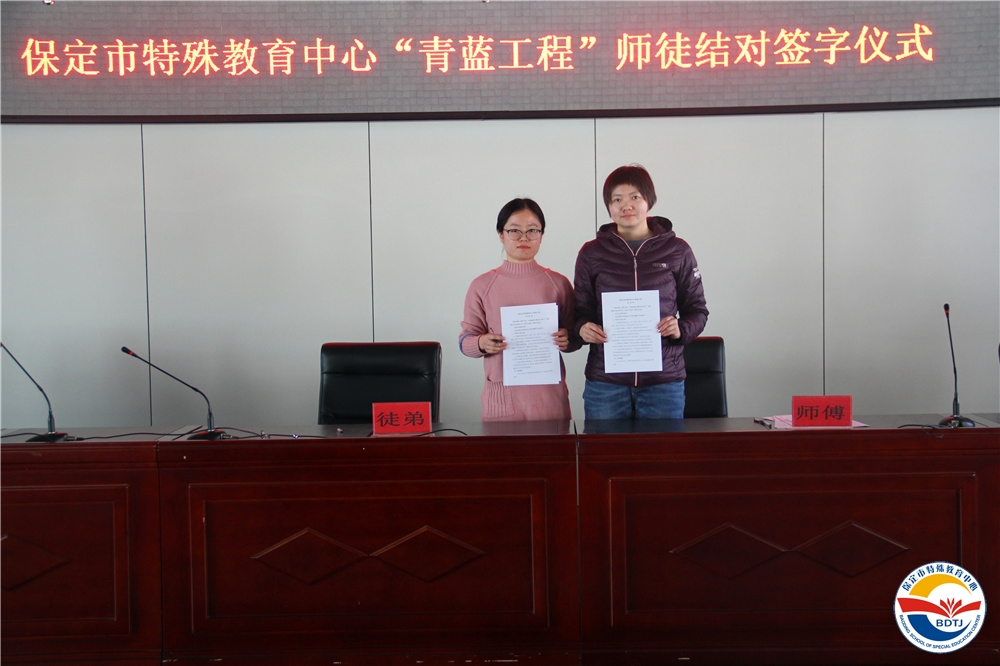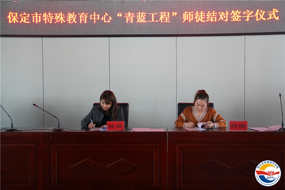 隨后,結(jié)對(duì)教師在“保定市特殊教育中心青藍(lán)工程師徒協(xié)議”上鄭重下自己的姓名,并拍照留念。他們簽下的是誓言,許下的是一份沉甸甸的承諾。