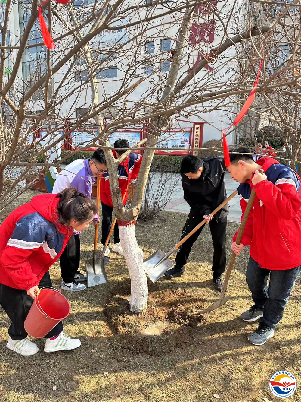 第二節(jié)課后黨員老師帶領同學們投入到熱火朝天的植樹活動中,同學們互相協(xié)作,揮鍬鏟土、扶苗培土、踏土夯苗、取水澆灌,到處都是忙碌的身影。同學們干勁十足,不亦樂乎,用自己的行動和汗水充分展現(xiàn)青少年的良好風貌和責任擔當,用愛心和行動表達著他們對小樹苗的悉心呵護。