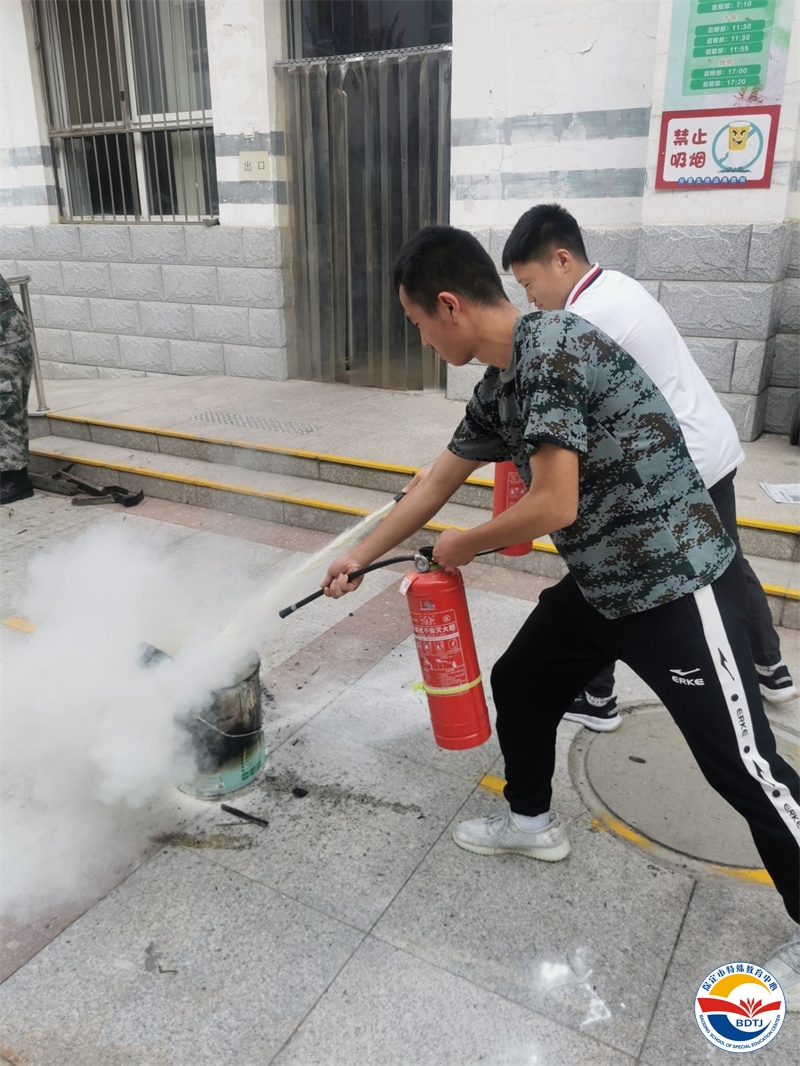 安全疏散演練結束后,安全辦與軍訓教官們?yōu)閷W生們講解了滅火器的正確使用方法。并且讓學生們進行滅火實操演練,提高了學生們的撲滅小型初期火情的能力,學生們通過實踐后進一步增強了消防器材使用能力和消防安全意識。