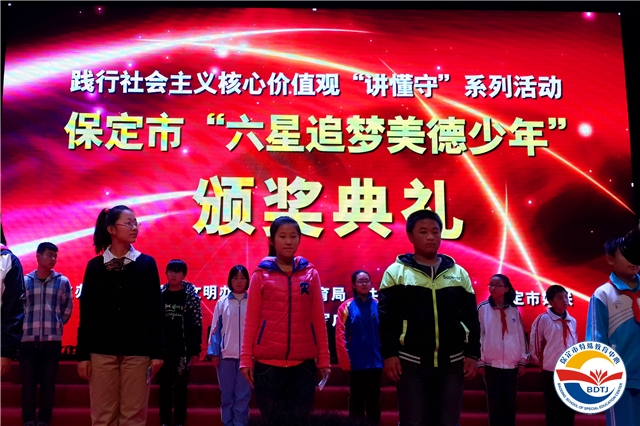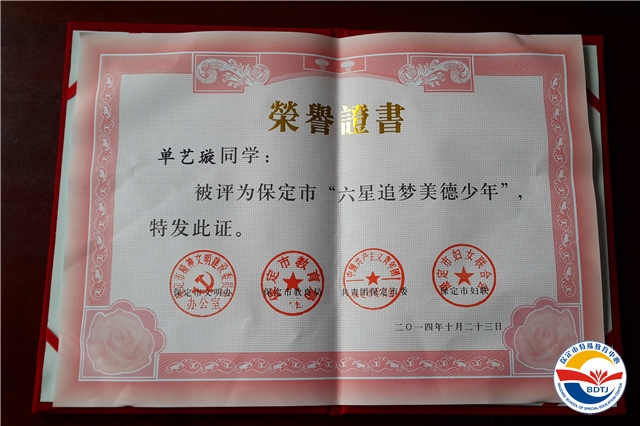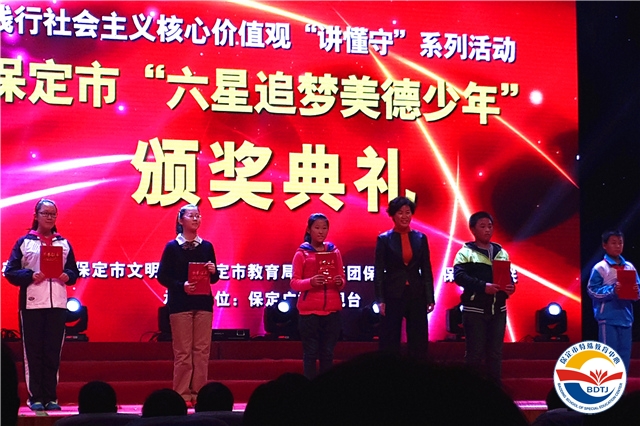 從今年4月起,市文明辦、市教育局、市團(tuán)委、市婦聯(lián)在全市未成年人中開展了“爭做六星追夢美德少年”活動。經(jīng)過學(xué)校評選、縣(市、區(qū))評選、市級評選三個(gè)階段,全市共評選出“六星追夢美德少年”候選人120名,包括互助之星、誠信之星、學(xué)習(xí)之星、勤儉之星、孝敬之星和自強(qiáng)之星各20名。我校單藝璇同學(xué)被榮幸的評為“學(xué)習(xí)之星”,于2014年10月30日下午,到百世開利會展中心接受表彰,閆立英副市長親自為單藝璇頒獎并合影留念。