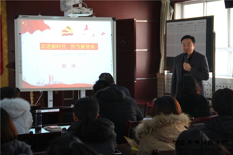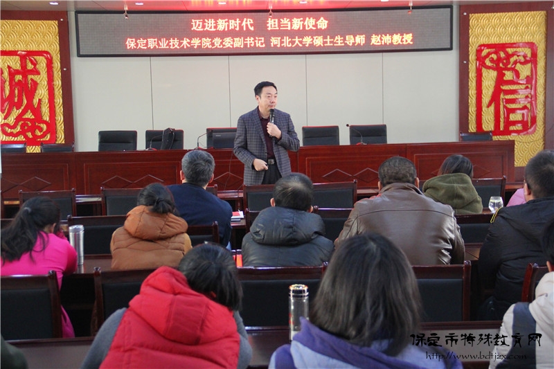 為了進(jìn)一步學(xué)習(xí)宣傳貫徹黨的十九大會(huì)議精神,幫助全體教職工更好領(lǐng)悟、理解十九大深刻內(nèi)涵,學(xué)校特邀保定職業(yè)技術(shù)學(xué)院黨委副書(shū)記、河北大學(xué)碩士生導(dǎo)師、保定市委組織部干部培訓(xùn)專家?guī)斐蓡T、黨的十九大精神宣講市委專家宣講團(tuán)成員趙沛教授,于12月15日下午在校五樓會(huì)議室,以《邁進(jìn)新時(shí)代 擔(dān)當(dāng)新使命》為題,為全體教職工做學(xué)習(xí)貫徹十九大精神專題輔導(dǎo)講座。講座由楊衛(wèi)國(guó)校長(zhǎng)主持。