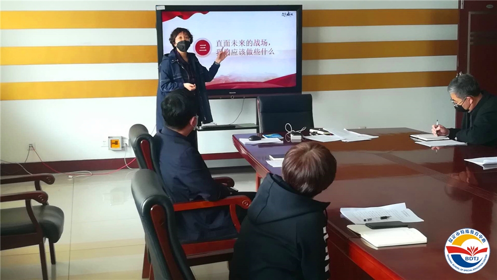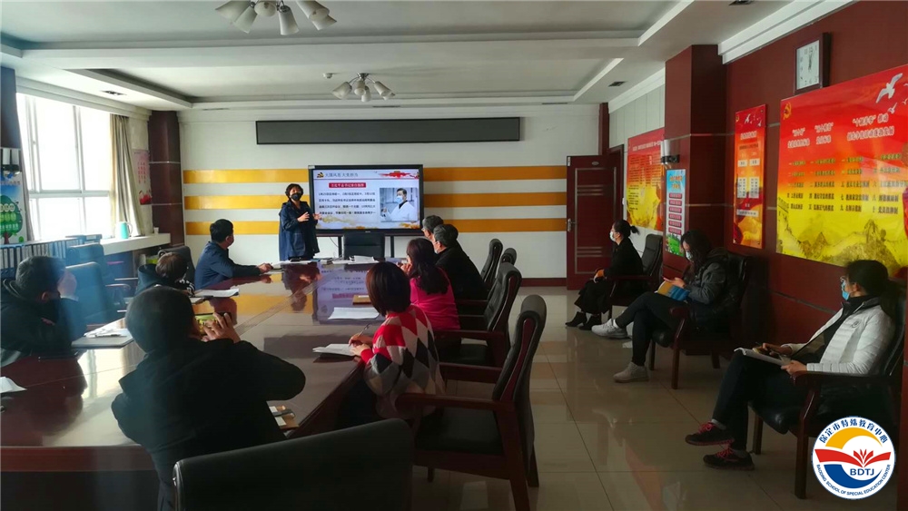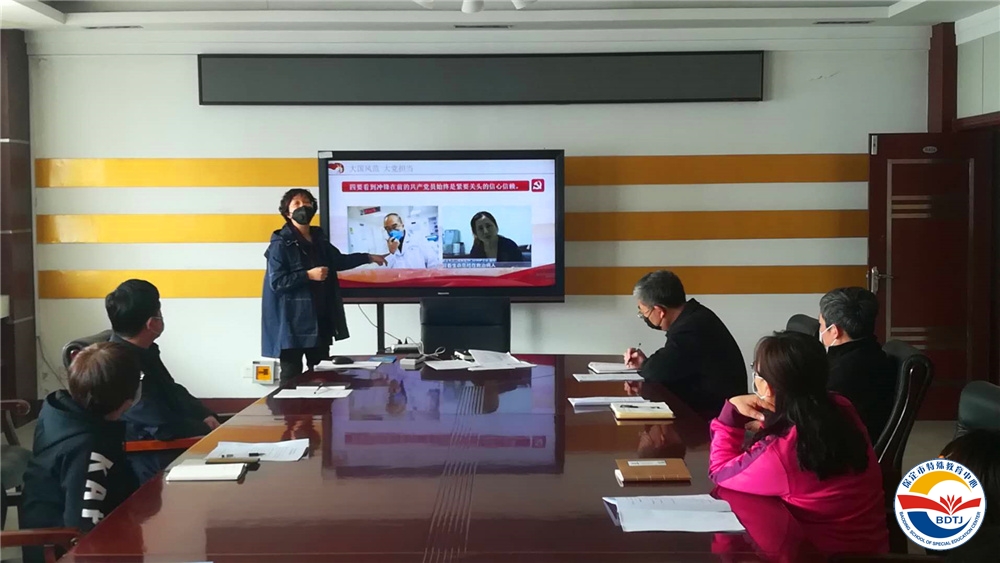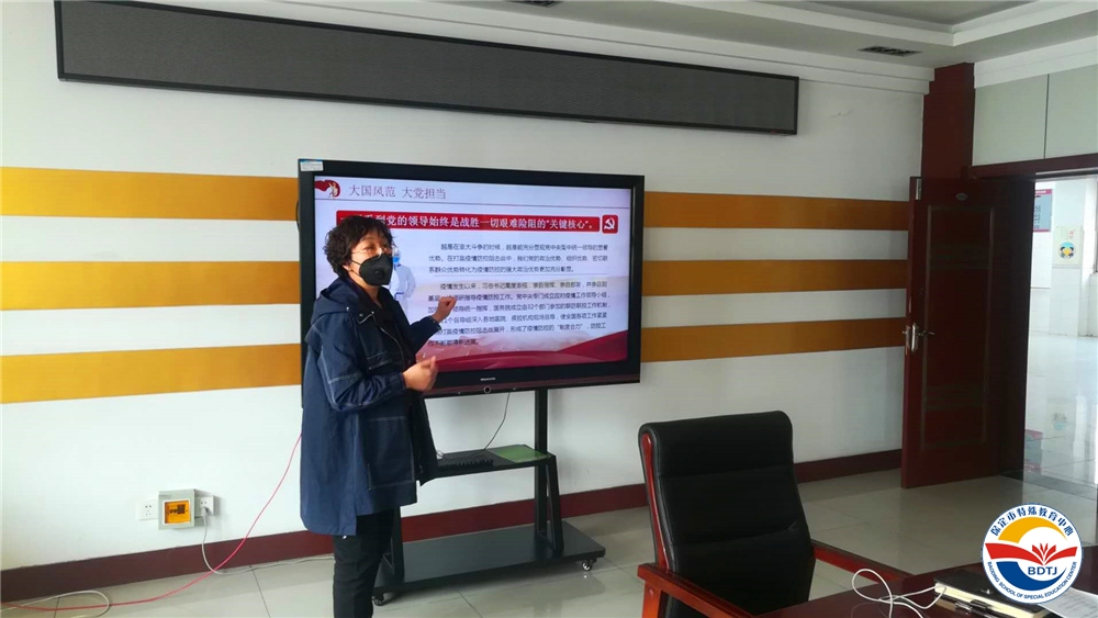 3月30日上午,保定市特教中心黨總支部書記武美英同志以“大國風(fēng)范、大黨擔(dān)當(dāng)”為題,對透過戰(zhàn)“疫”的烽煙,我們應(yīng)當(dāng)看到什么?對接戰(zhàn)斗的進(jìn)程,我們應(yīng)當(dāng)做什么?直面未來的戰(zhàn)場,我們應(yīng)該做些什么?進(jìn)行了深刻的闡述,利用學(xué)習(xí)強(qiáng)國視頻平臺為學(xué)校全體黨員上了一堂精彩的線上直播黨課。市教育局下沉干部崔海濤、楊虹,學(xué)校領(lǐng)導(dǎo)班子以及部分中層干部、黨員教師現(xiàn)場參加了黨課學(xué)習(xí)。