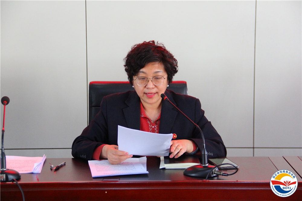 副校長(zhǎng)滿紅宇宣讀《中共保定市特殊教育中心黨支部關(guān)于在全校開展黨史學(xué)習(xí)教育的實(shí)施方案》。首先堅(jiān)持政治站位,準(zhǔn)確把握總體要求。開展黨史學(xué)習(xí)教育,要把黨史學(xué)習(xí)教育和慶祝中國(guó)共產(chǎn)黨100周年結(jié)合起來,與推動(dòng)當(dāng)前教育改革發(fā)展穩(wěn)定各項(xiàng)工作結(jié)合起來,與狠抓學(xué)校的中心工作結(jié)合起來,與開展學(xué)生的思想政治工作結(jié)合起來,與思想政治理論課改革創(chuàng)新結(jié)合起來。把在學(xué)習(xí)教育中激發(fā)出來的工作熱情,奮斗精神,轉(zhuǎn)化為推動(dòng)特殊教育事業(yè)發(fā)展的強(qiáng)大動(dòng)力。其次全力抓好重點(diǎn)任務(wù),扎實(shí)有序有效推進(jìn)活動(dòng)深入開展。加強(qiáng)宣傳教育、組織專題培訓(xùn),開展黨史教育日常“八個(gè)一工程”。一是建立“紅色資訊網(wǎng)”,立足于保定黨史資料。利用冉莊地道戰(zhàn),狼牙山五壯士,白洋淀雁翎隊(duì)小兵張嘎,唐縣、阜平、淶源等紅色革命基地開展黨史教育。二是開展紅旗論壇,以沙龍的形式引入黨史教育,根據(jù)保定黨史資源,確定黨史討論主題,將黨史教育日?;钊牖?。三是保定革命遺跡之行。以七一、十一等重要節(jié)日巡訪紅色教育基地,增強(qiáng)黨員的革命英雄主義和愛國(guó)主義。四是開展黨史基本知識(shí)大賽活動(dòng)。以地方鮮活的黨史,激發(fā)黨員學(xué)黨史的興趣,帶動(dòng)黨員了解保定黨的歷史。五是“青春之歌”紅歌會(huì),依托紅歌資源,進(jìn)行黨史教育,通過歌謠傳唱的形式在黨員口中開花結(jié)果。六是預(yù)備黨員(或積極分子)生日對(duì)話,通過生日對(duì)話的形式,與預(yù)備黨員或黨員積極分子進(jìn)行談話交流,宣講黨員的先進(jìn)性。七是建立共產(chǎn)黨員先進(jìn)模范崗。八是讓每個(gè)黨員重溫自己的第一次入黨申請(qǐng)書,重溫自己最初的夢(mèng)想,不忘初心。最后要加強(qiáng)組織領(lǐng)導(dǎo),確保取得扎實(shí)成效。強(qiáng)化責(zé)任落實(shí),強(qiáng)化督促指導(dǎo),把握正確方向,加強(qiáng)強(qiáng)宣傳引導(dǎo),切實(shí)把黨史學(xué)習(xí)教育成效轉(zhuǎn)化為強(qiáng)大精神動(dòng)力。