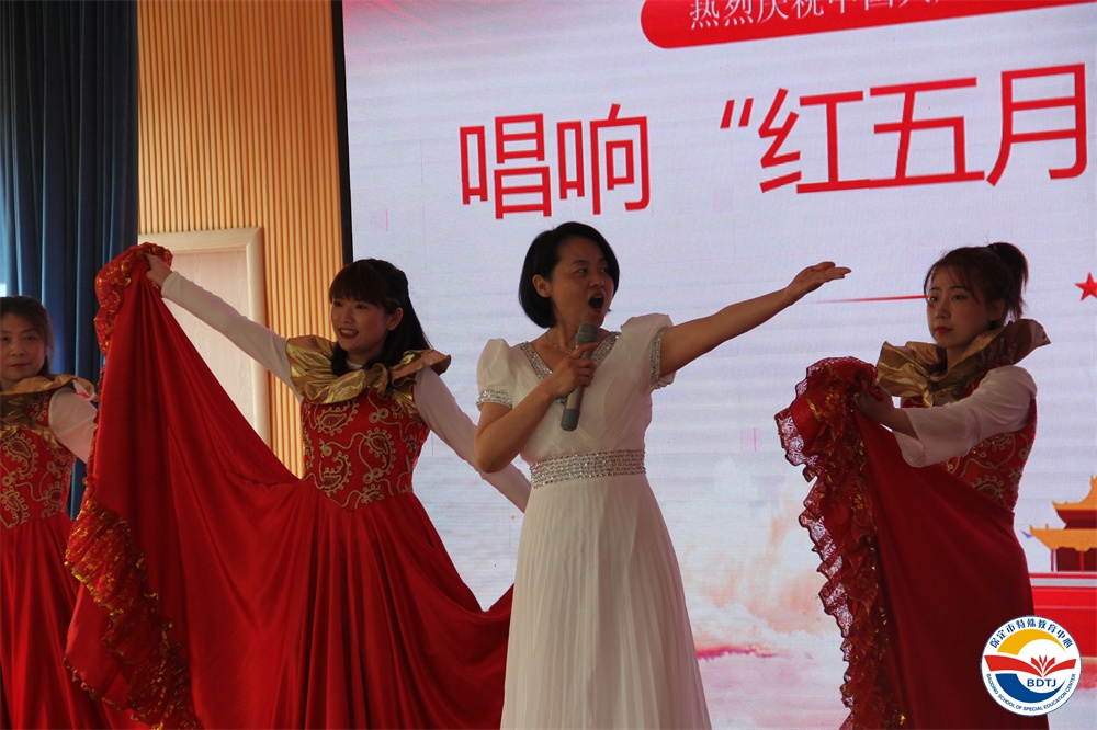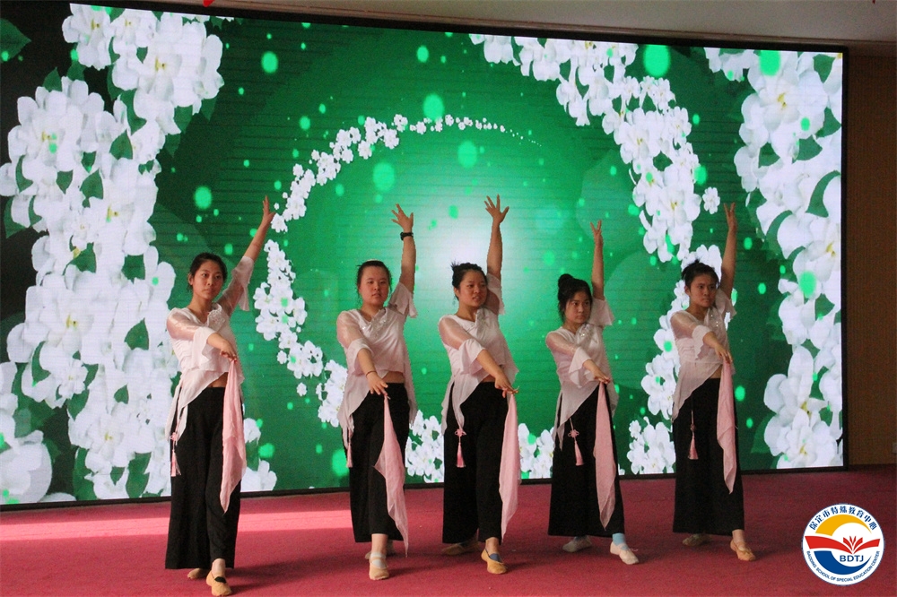 演出在歌伴舞《我愛你中國》中拉開帷幕,青年教師舞蹈團(tuán)成員用飽含熱情的舞步深刻表達(dá)了對祖國的喜愛。由青年教師蘆芳芳深情演唱的《我愛你中國》傳遞出中國人民對祖國母親的深深愛戴。教師陳楊指導(dǎo)啟聰學(xué)前及二年級排練的《歌聲與微笑》,充分體現(xiàn)了啟聰兒童幸福的快樂的生活。車克老師為啟明學(xué)生編排了《杯子舞—紅旗飄飄》,整齊歡快的杯子舞展現(xiàn)了我們中國的強(qiáng)大以及特教孩子們對祖國的熱愛之情。青年教師車克演唱《聽媽媽講那過去的故事》感情細(xì)膩真摯的表現(xiàn)了“媽媽”在舊社會歷經(jīng)苦難才盼來新社會;情景交融的描繪,給人以美的熏陶。楊柳、劉涇渭教師演唱的歌曲《讓我們蕩起雙槳》將演出推向了高潮。歌曲描繪了新中國的花朵們在灑滿陽光的湖面上,劃著小船盡情游玩、愉快唱歌的歡樂景象。形象地勾勒出孩子們用力劃槳,奮勇前進(jìn)的情景,展現(xiàn)了老一輩革命家用生命換來的和平年代,使得我們倍加珍惜現(xiàn)在的美好生活。他們精湛的演出贏得了現(xiàn)場學(xué)生和教師的陣陣掌聲。文藝匯演展現(xiàn)了特教中心教師員工朝氣蓬勃、積極向上、文明和諧的精神風(fēng)貌。