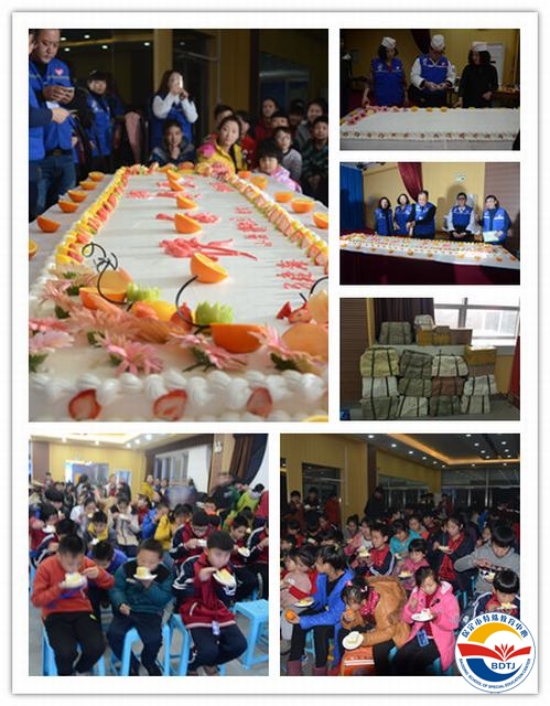 2016年12月21日下午17:30分,一個(gè)80cm*120cm的巨型蛋糕呈現(xiàn)在保定市特殊教育中心孩子們的眼前,這款巨型蛋糕是由“保定狼行天下 愛心救助”的愛心人士歷經(jīng)2個(gè)多小時(shí)現(xiàn)場制作,精心為孩子們準(zhǔn)備的冬至禮物。