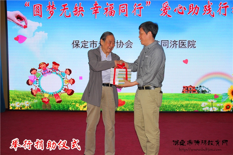 在捐贈(zèng)儀式現(xiàn)場(chǎng),曹挺副校長(zhǎng)首先發(fā)表了熱情洋溢的致辭。曹校長(zhǎng)首先向保定市老年協(xié)會(huì)和保定同濟(jì)醫(yī)院介紹了學(xué)校各項(xiàng)發(fā)展和取得的成績(jī),特別代表學(xué)校全體師生感謝保定市老年協(xié)會(huì)和保定同濟(jì)醫(yī)院愛心捐助,感謝社會(huì)各界對(duì)殘疾兒童的關(guān)愛。并表示將進(jìn)一步為殘障孩子的終生發(fā)展奠基,讓學(xué)生在學(xué)校健康快樂的成長(zhǎng)!