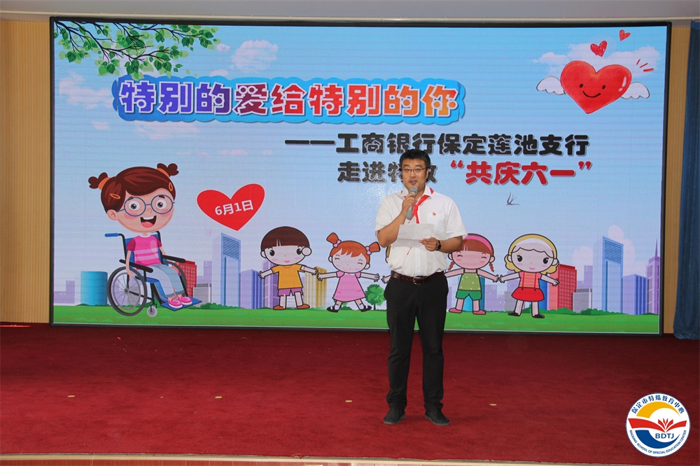 工商銀行保定蓮池區(qū)支行副行長田坤圃發(fā)表講話,對可愛的同學(xué)致以節(jié)日的祝福,向辛勤耕耘的特教老師致以崇高的敬意,希望社會各界更多關(guān)注特殊學(xué)生,讓孩子們在這里插上翅膀,展翅翱翔!