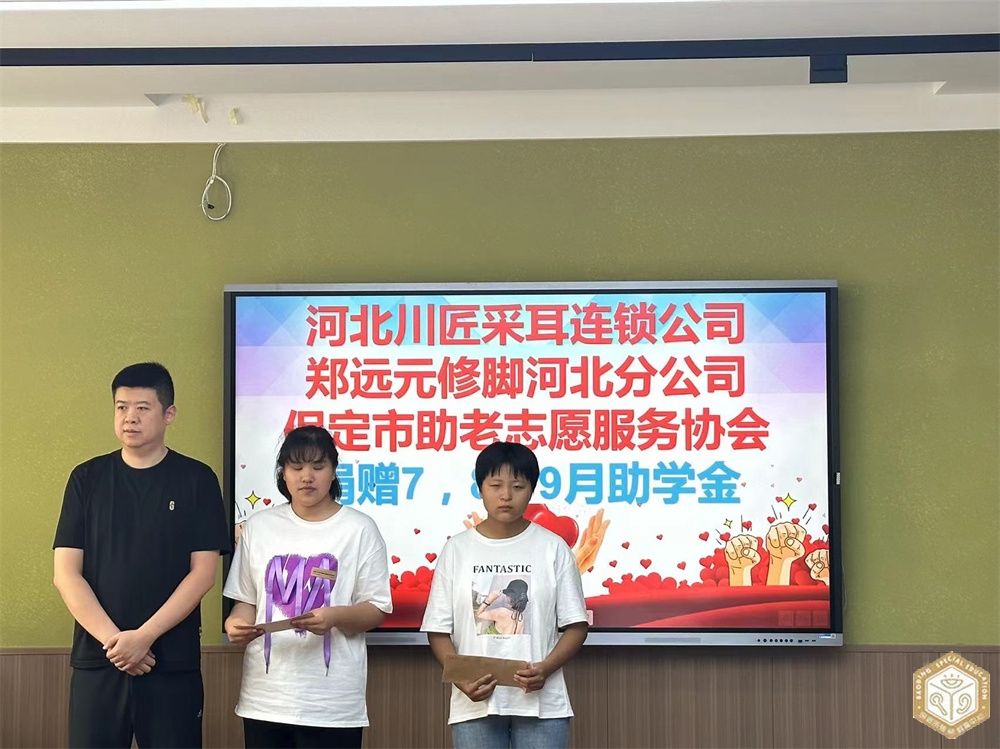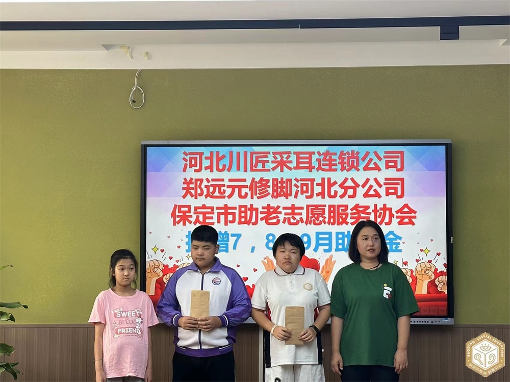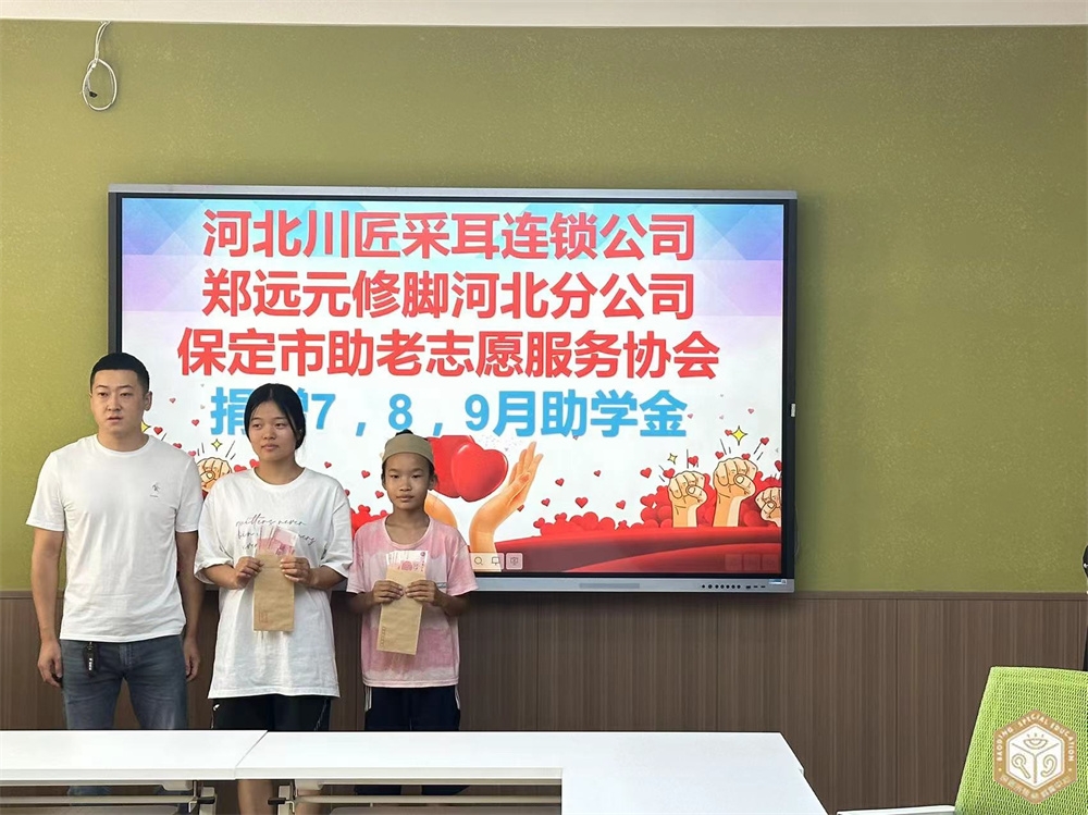 2023年9月2日下午,河北川匠采耳連鎖有限公司、鄭遠(yuǎn)元修腳河北分公司、保定市助老志愿服務(wù)協(xié)會,帶著愛心、帶著希望、帶著祝福,走進(jìn)了保定市特殊教育中心,為6名困難學(xué)生,捐贈7、8、9月助學(xué)金每人1500元,共計(jì)9000元。