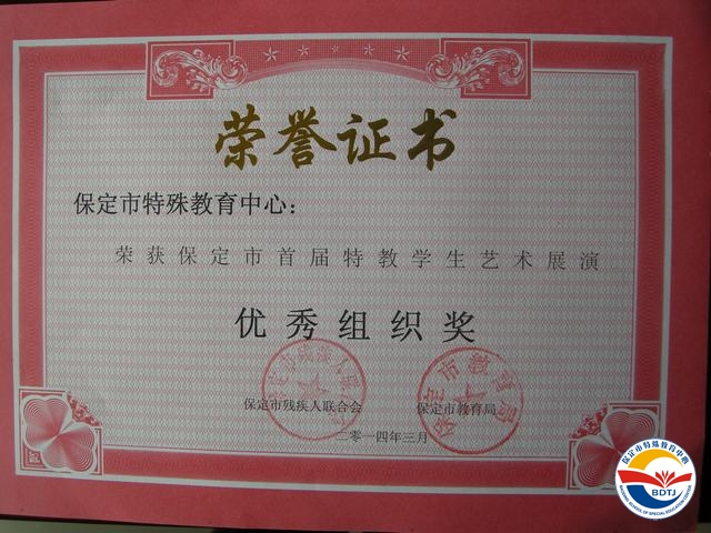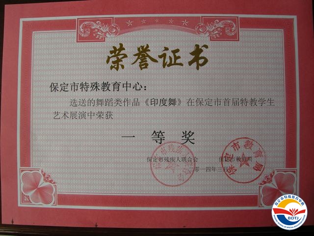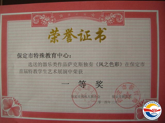 為了促進(jìn)特殊教育藝術(shù)水平的發(fā)展,市殘聯(lián)和市教育局舉辦了首屆特教學(xué)生藝術(shù)展演出,我校啟聰部學(xué)生的《印度舞》、啟明部學(xué)生的薩克斯獨(dú)奏《風(fēng)之色彩》均獲一等獎(jiǎng),車克 、楊柳、鄧芳芳獲優(yōu)秀指導(dǎo)教師獎(jiǎng),我校獲得優(yōu)秀組織獎(jiǎng)。