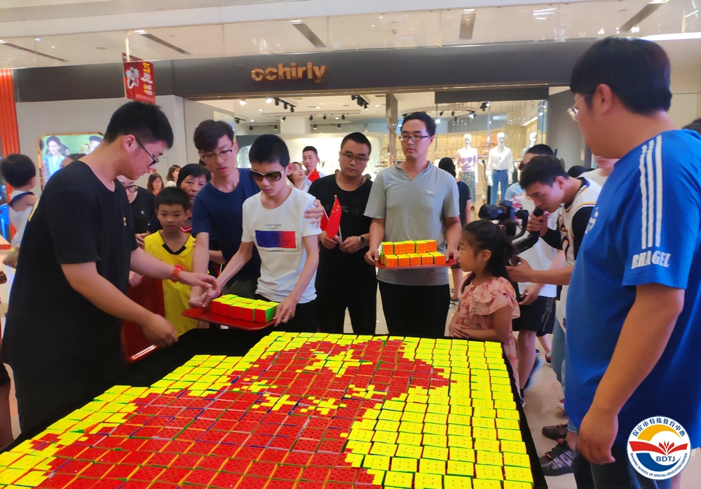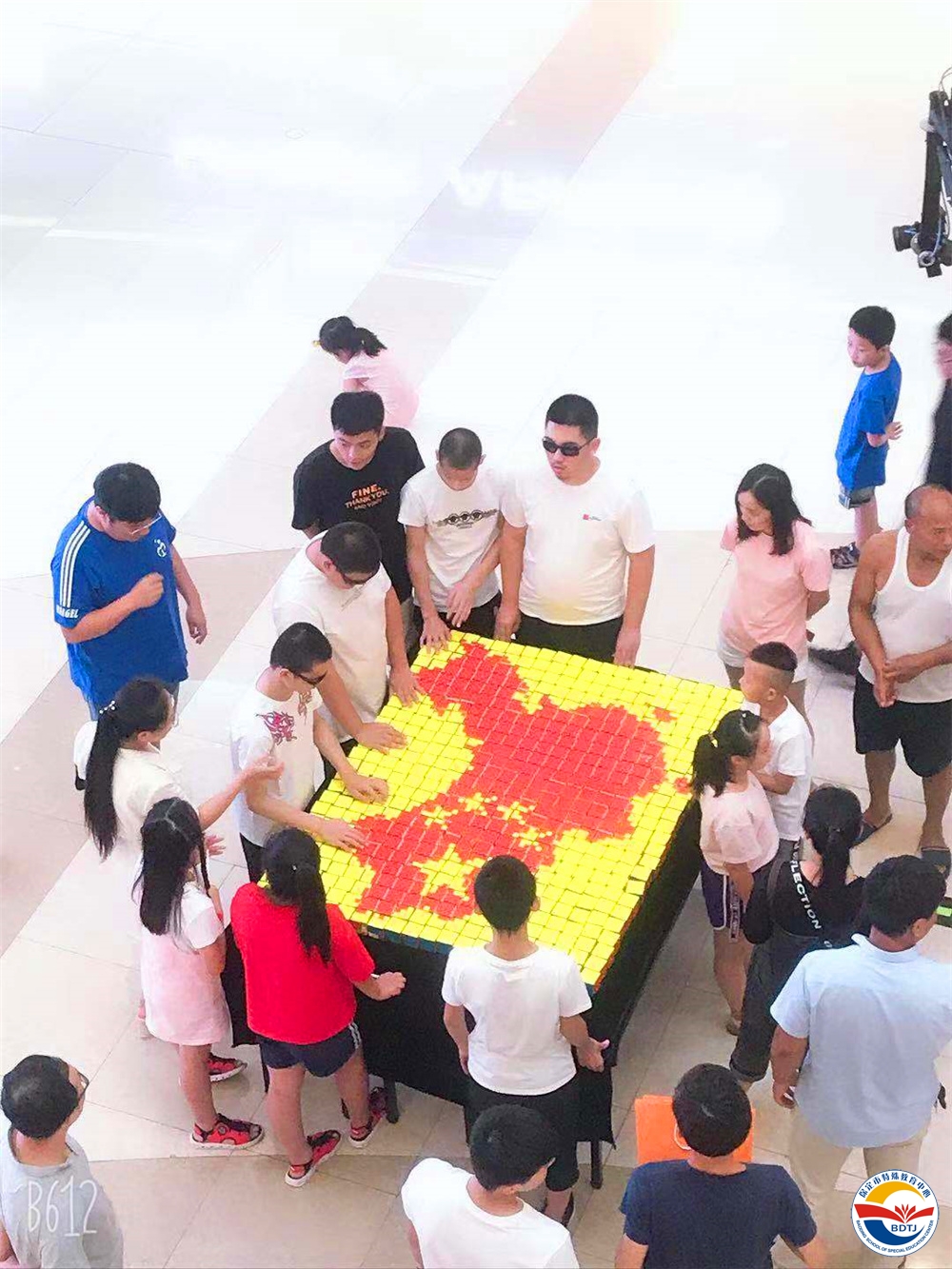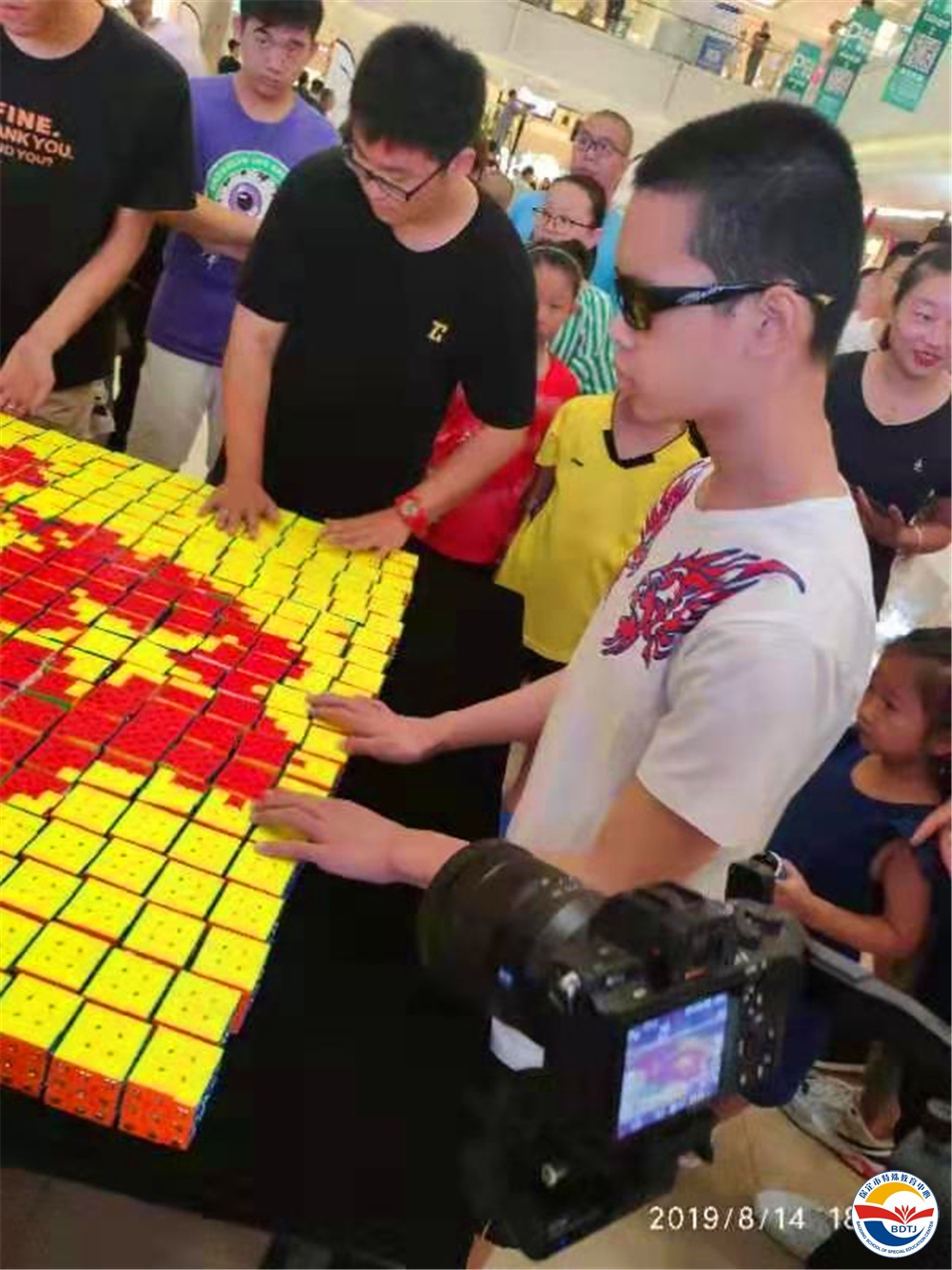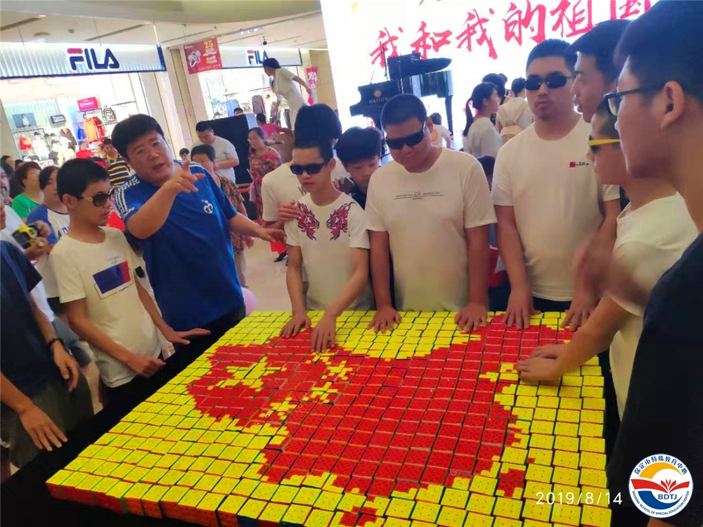 2019年8月14日傍晚,為了參加央視的節(jié)目選拔,一場(chǎng)特殊的“我和我的祖國(guó)”快閃活動(dòng)在萬(wàn)博廣場(chǎng)一樓中庭精彩上演?;顒?dòng)在悠揚(yáng)的鋼琴聲及童聲合唱《我和我的祖國(guó)》中拉開了序幕。保定市特殊教育中心啟明部的5名視障學(xué)生,用500個(gè)魔方拼出了祖國(guó)的版圖,他們用這樣一種特殊的方式,向祖國(guó)70周年華誕獻(xiàn)禮。他們的用心,讓所有人為之動(dòng)容;他們蓬勃向上的朝氣,引得人們停住了腳步,紛紛駐足觀望。
