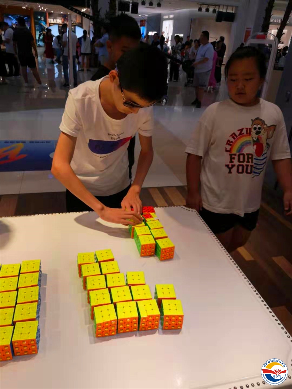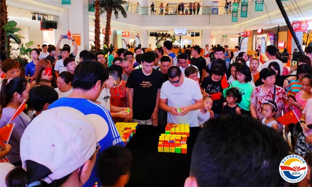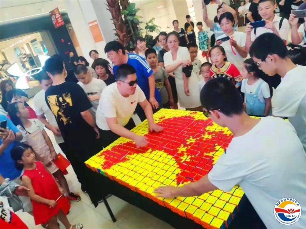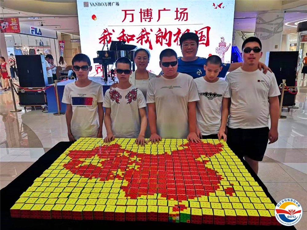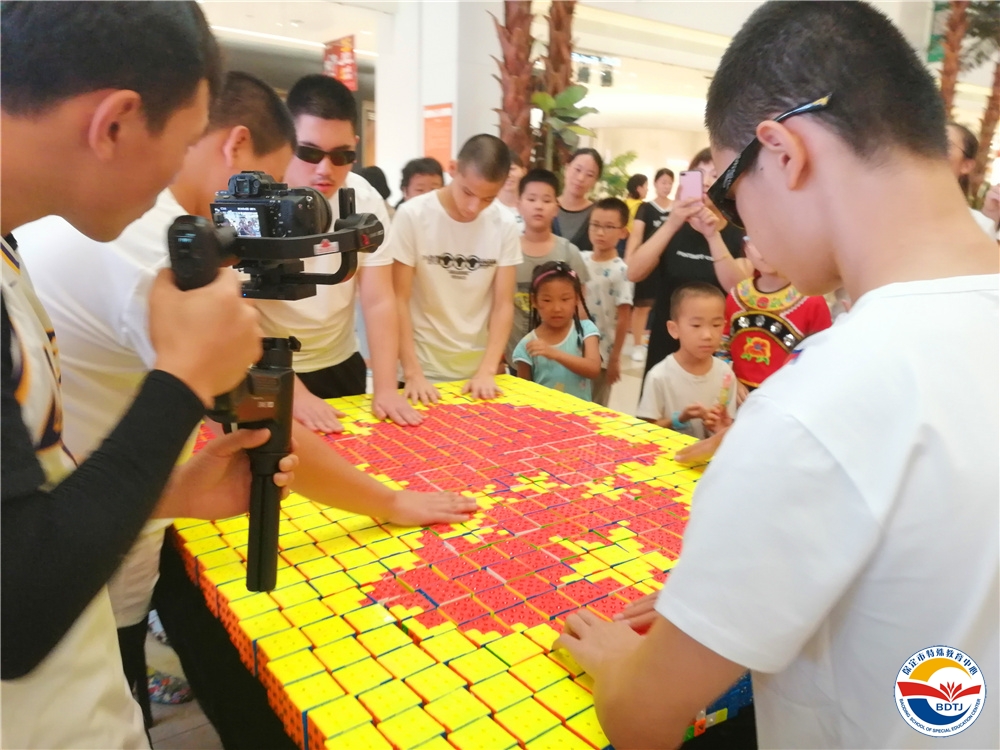 2019年8月14日傍晚,為了參加央視的節(jié)目選拔,一場(chǎng)特殊的“我和我的祖國(guó)”快閃活動(dòng)在萬(wàn)博廣場(chǎng)一樓中庭精彩上演?;顒?dòng)在悠揚(yáng)的鋼琴聲及童聲合唱《我和我的祖國(guó)》中拉開了序幕。保定市特殊教育中心啟明部的5名視障學(xué)生,用500個(gè)魔方拼出了祖國(guó)的版圖,他們用這樣一種特殊的方式,向祖國(guó)70周年華誕獻(xiàn)禮。他們的用心,讓所有人為之動(dòng)容;他們蓬勃向上的朝氣,引得人們停住了腳步,紛紛駐足觀望。