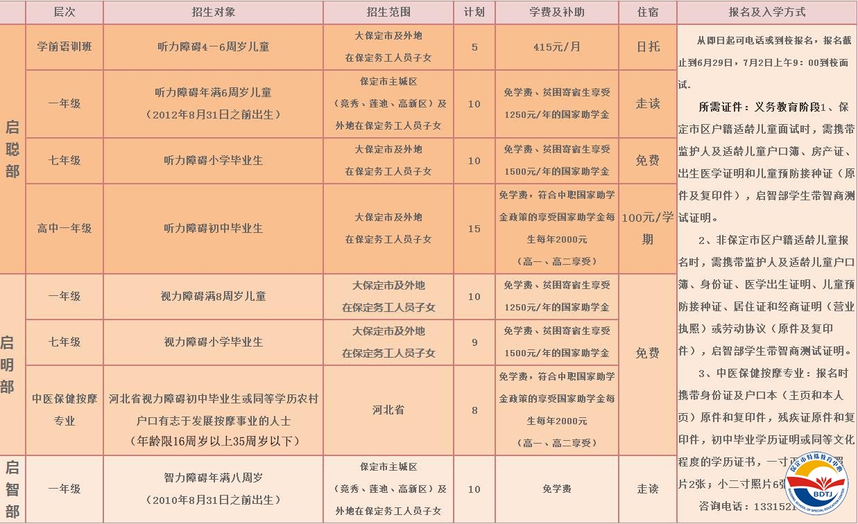 學(xué)校啟明部現(xiàn)有學(xué)生98人,6個(gè)教學(xué)班,專任教師19人。經(jīng)過多年的教學(xué)實(shí)踐,探索出“醫(yī)校結(jié)合”的辦學(xué)模式。學(xué)校從2009年開始招收視障學(xué)生,2014年經(jīng)河北省教育廳、河北省中醫(yī)藥管理局批準(zhǔn),與保定市第三中心醫(yī)院聯(lián)合開辦了盲人中醫(yī)按摩保健專業(yè),詣在培養(yǎng)盲生按摩技能,為將來就業(yè)奠定基礎(chǔ)。