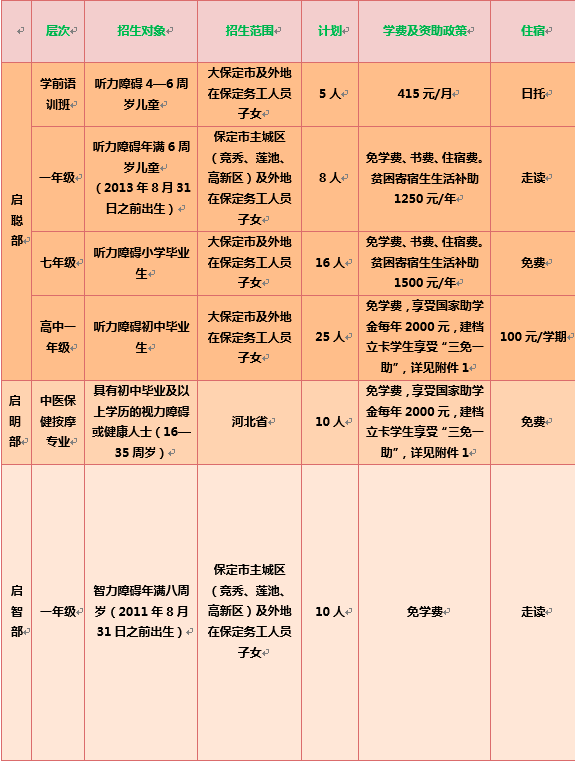 從即日起可電話或到校報名,報名截止到6月20日,面試時間另行通知。 所需證件:義務教育階段1、保定市區(qū)戶籍適齡兒童面試時,需攜帶監(jiān)護人及適齡兒童戶口簿、身份證、殘疾證、出生醫(yī)學證明和兒童預防接種證(原件及復印件),啟智部學生帶智商測試證明。 2、非保定市區(qū)戶籍適齡兒童報名時,需攜帶監(jiān)護人及適齡兒童戶口簿、身份證、醫(yī)學出生證明、兒童預防接種證、居住證和經(jīng)商證明(營業(yè)執(zhí)照)或勞動協(xié)議(原件及復印件),啟智部學生帶智商測試證明。 3、中醫(yī)保健按摩專業(yè):報名時攜帶身份證及戶口本(主頁和本人頁)原件和復印件,殘疾證原件和復印件,初中畢業(yè)證,一寸藍底正面免冠照片2張;小二寸藍底照片6張。 咨詢電話:13315210944 |