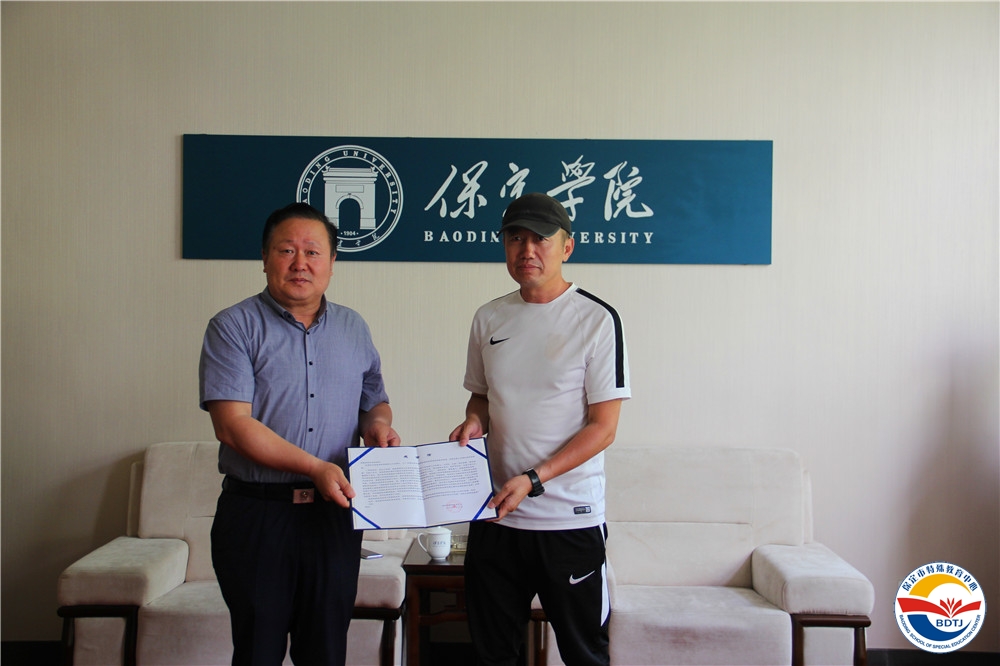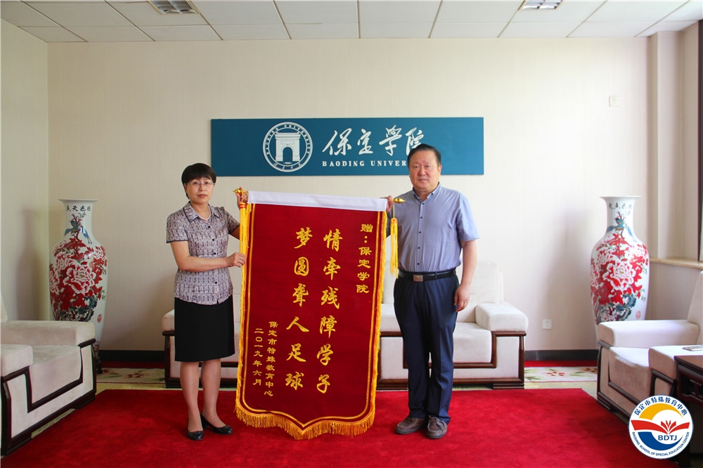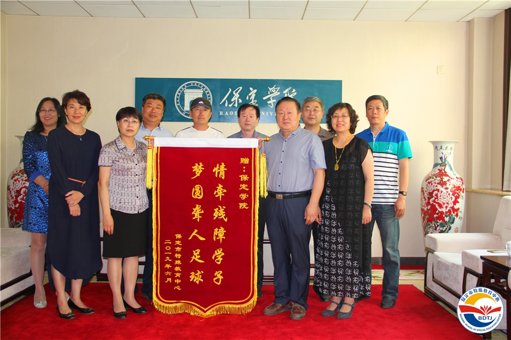 6月3日上午,保定市特殊教育中心校長楊衛(wèi)國,黨支部書記武美英,副校長周建忠、曹挺一行,帶著感謝信和錦旗來到保定學(xué)院,對保定學(xué)院體育學(xué)院張春武教授作為主教練,8年如一日對我校聾人足球隊所做的奉獻及此次全運會帶領(lǐng)球隊取得優(yōu)異成績表示感謝,對保定學(xué)院及保定學(xué)院體育學(xué)院領(lǐng)導(dǎo)對特殊教育的關(guān)心與支持表示衷心感謝。