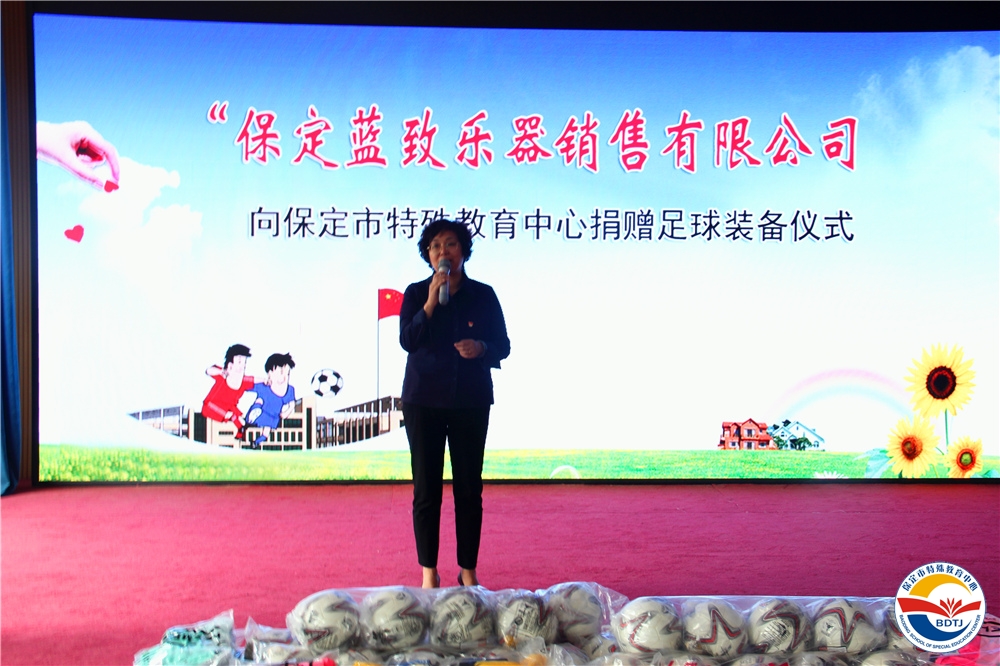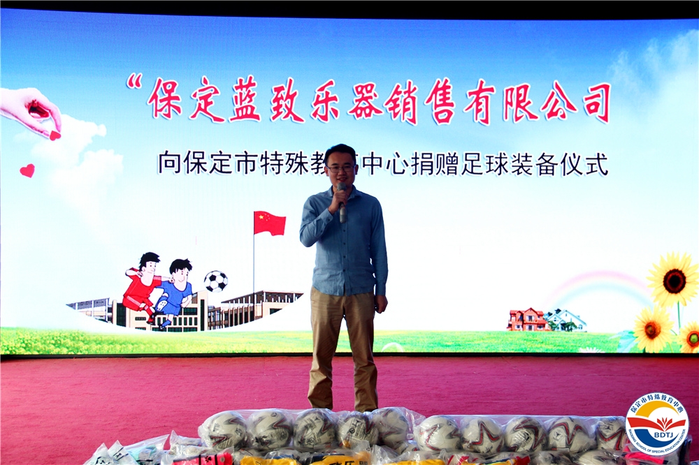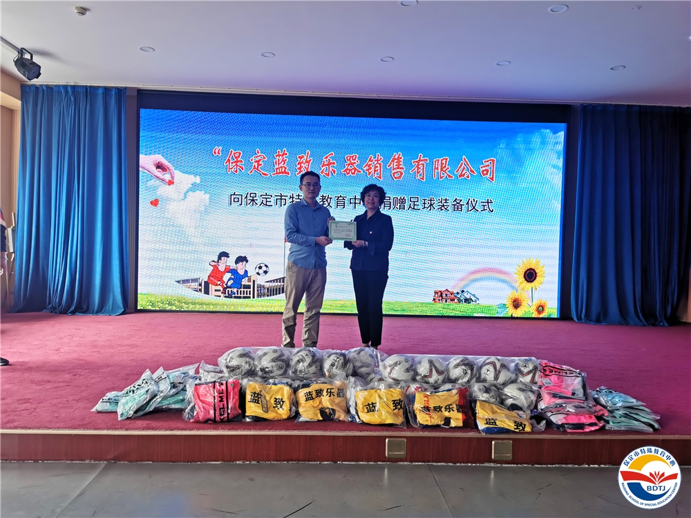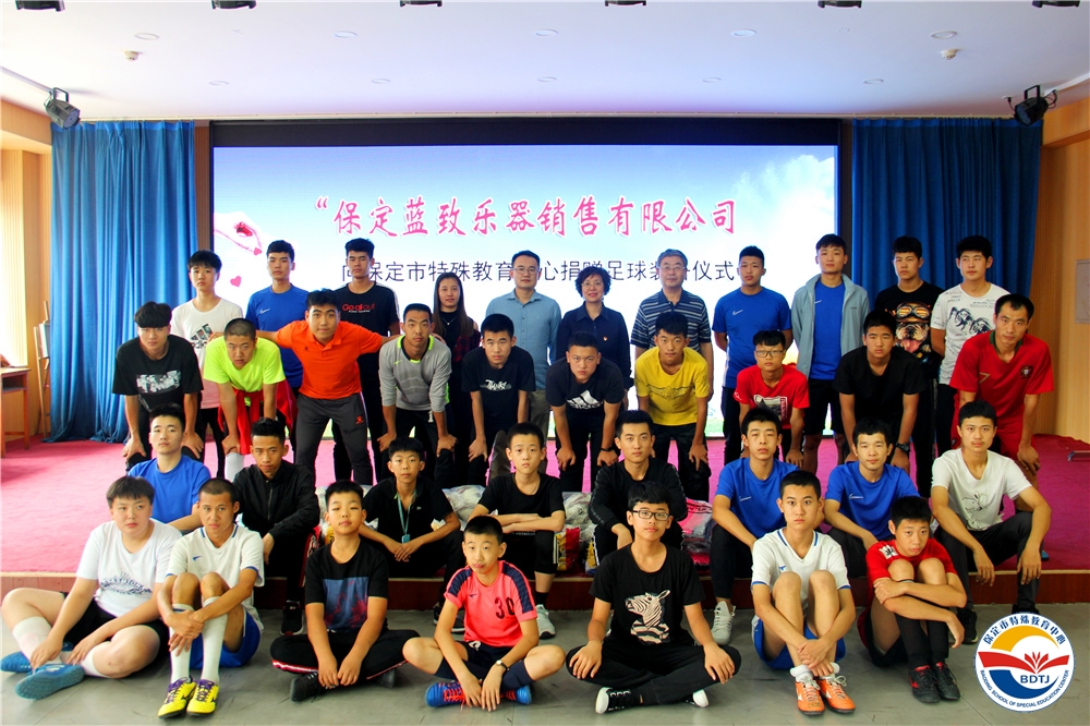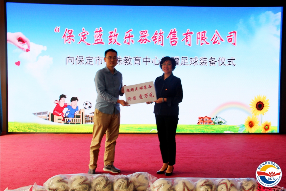 清風送爽、秋色宜人。9月19日下午,保定市特殊教育中心三樓多功能廳,愛心傳遞,暖流涌動。來自保定藍致樂器銷售有限公司領導和志愿者們,帶著為我校聾人足球隊捐贈的價值一萬元的足球訓練裝備,走進保定市特殊教育中心,用自己的實際行動詮釋了樂善好施的品德,充分彰顯了他們的愛心與魄力。